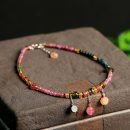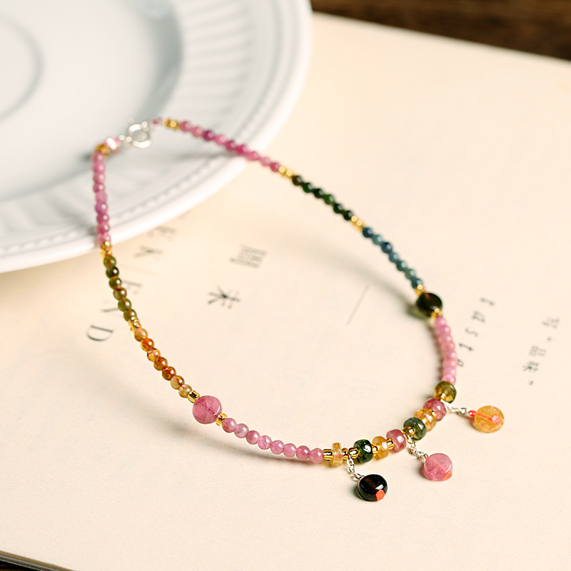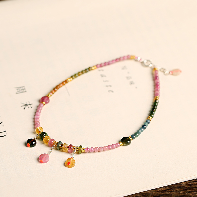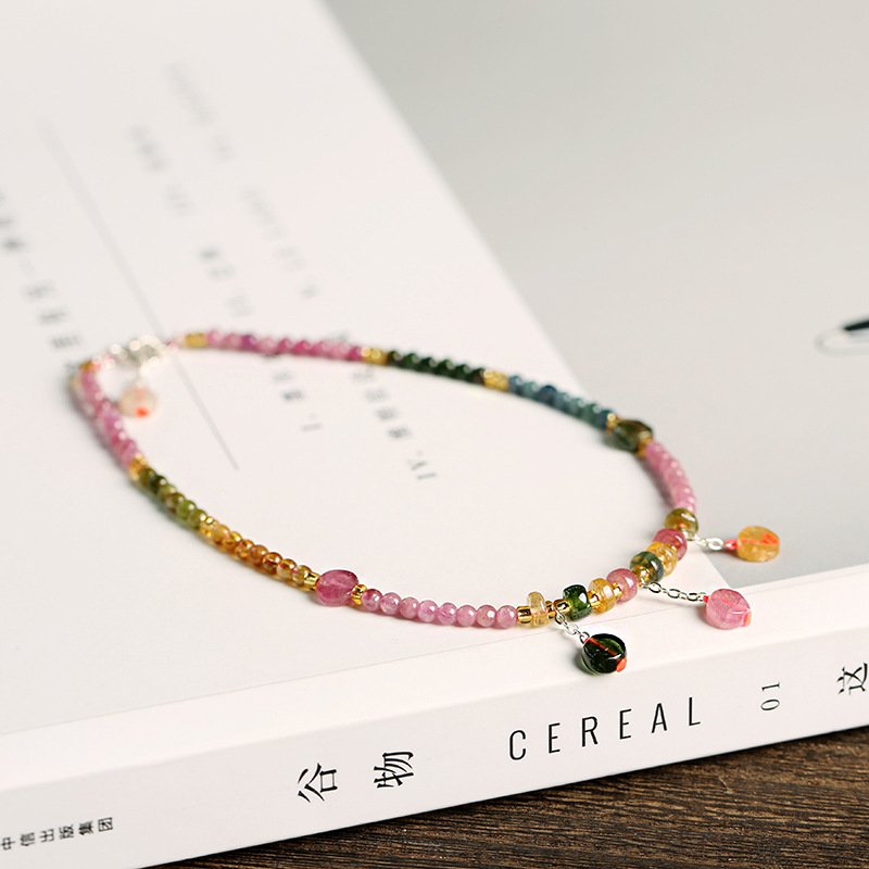 天然糖果碧璽配925純銀隔珠帶吊墜甜美單圈手鍊 (碧璽)