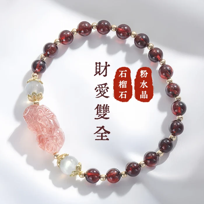 財愛雙全 | 天然石榴石配草莓晶貔貅手鍊 | 14K包金 | 促人緣招財運正桃花天然石榴石草莓晶女招財水晶手鍊