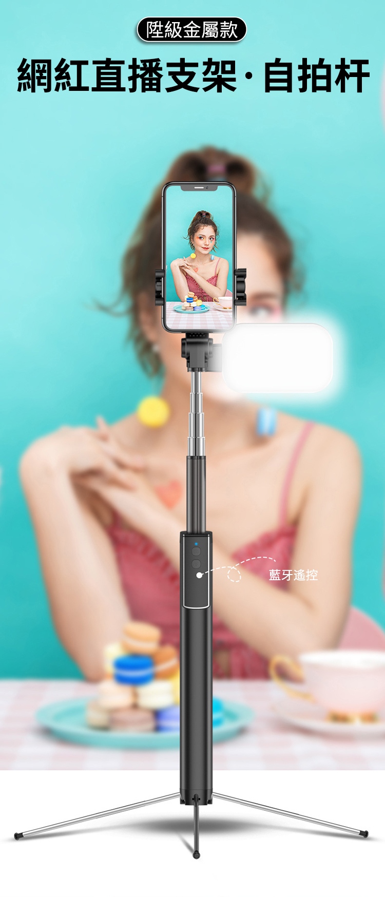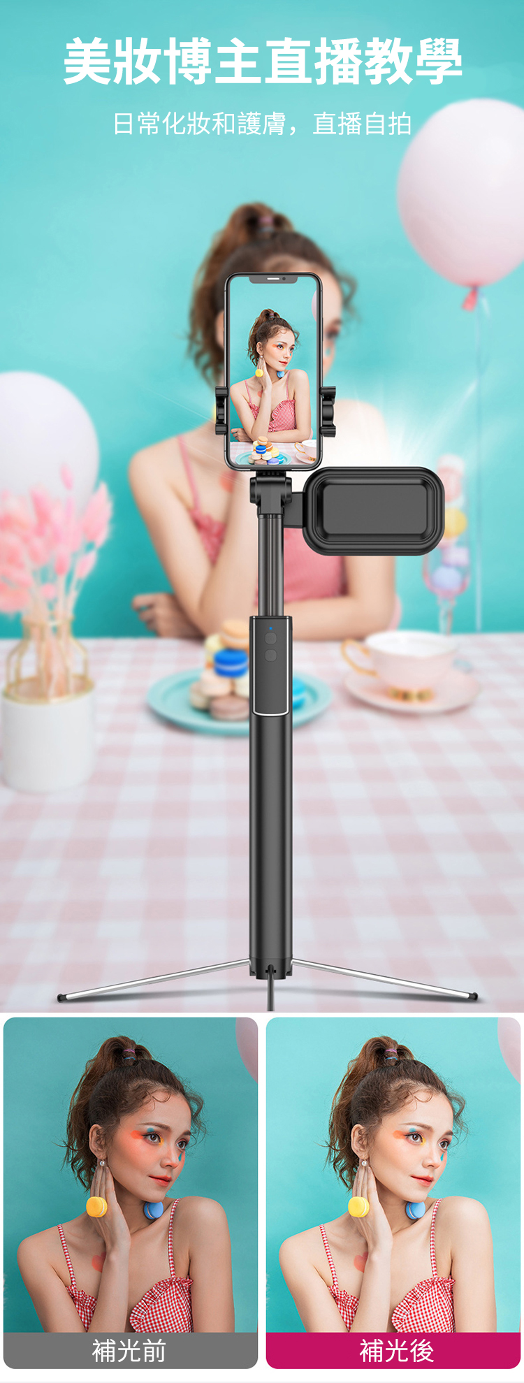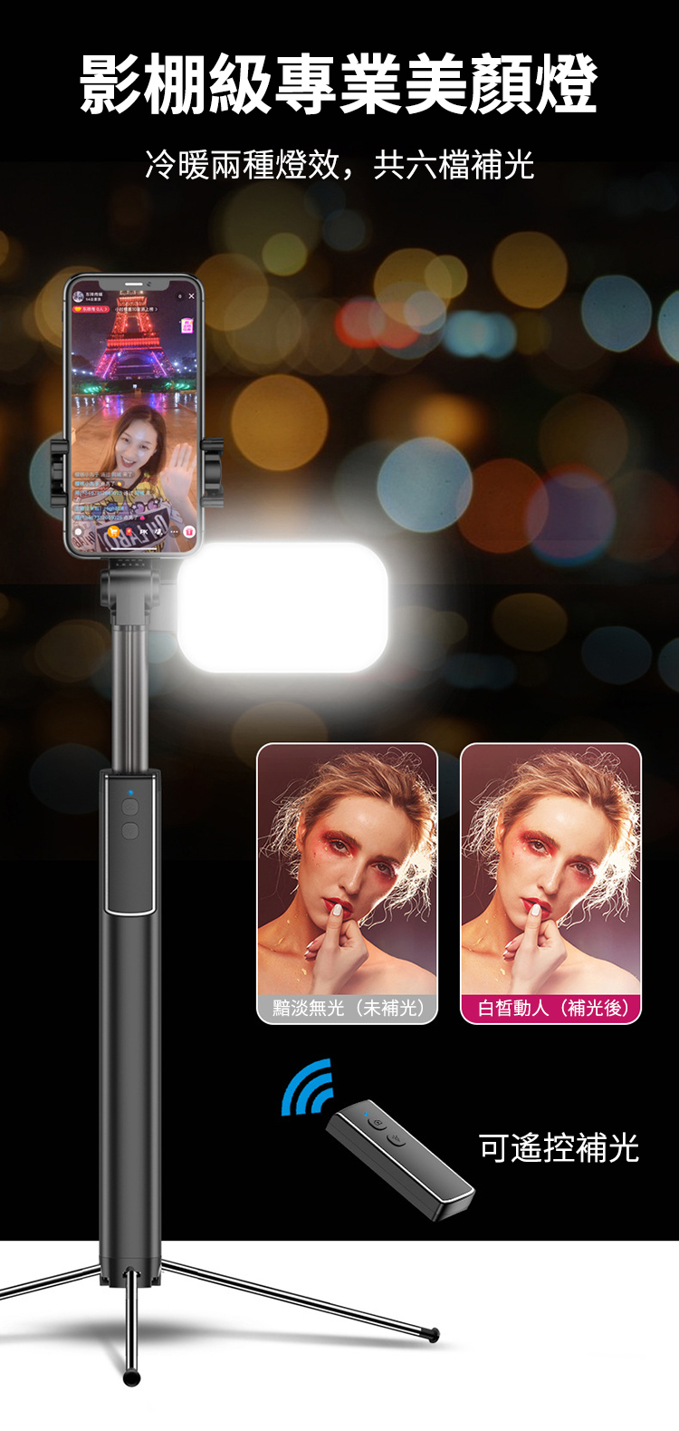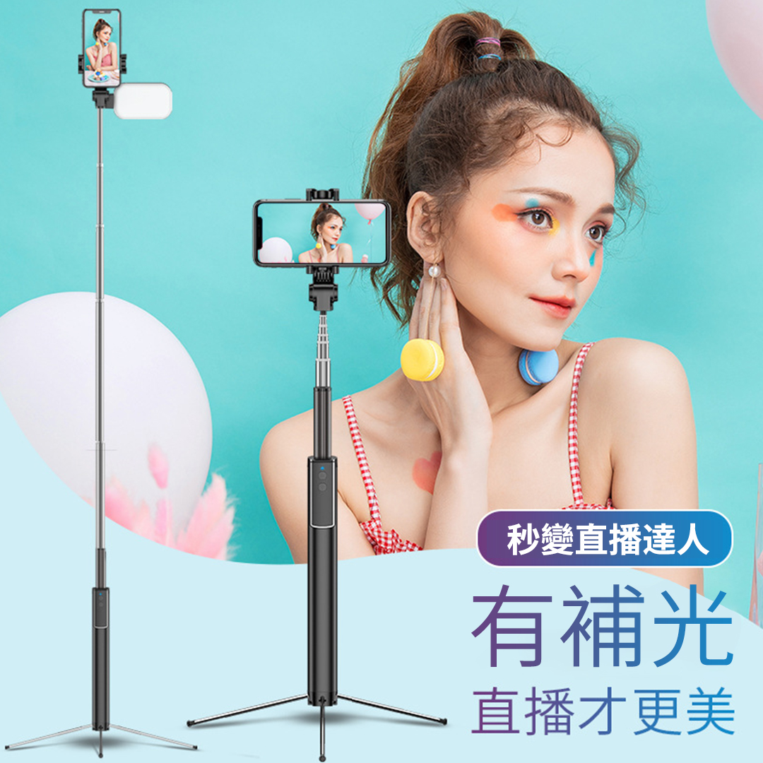 【美顏補光藍牙自拍棒】【影棚級美顏燈】【六段超級伸縮】超實用便攜一體式專業影棚級補光燈手機直播支架無線藍芽自拍棒