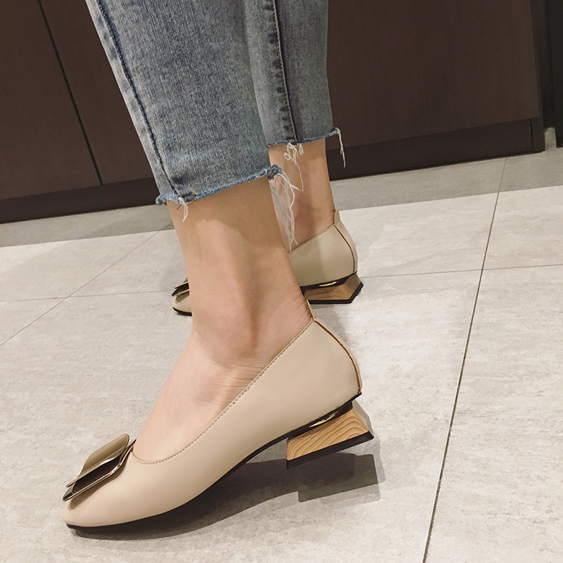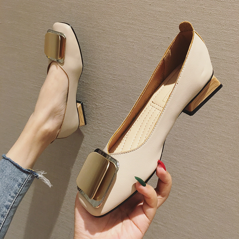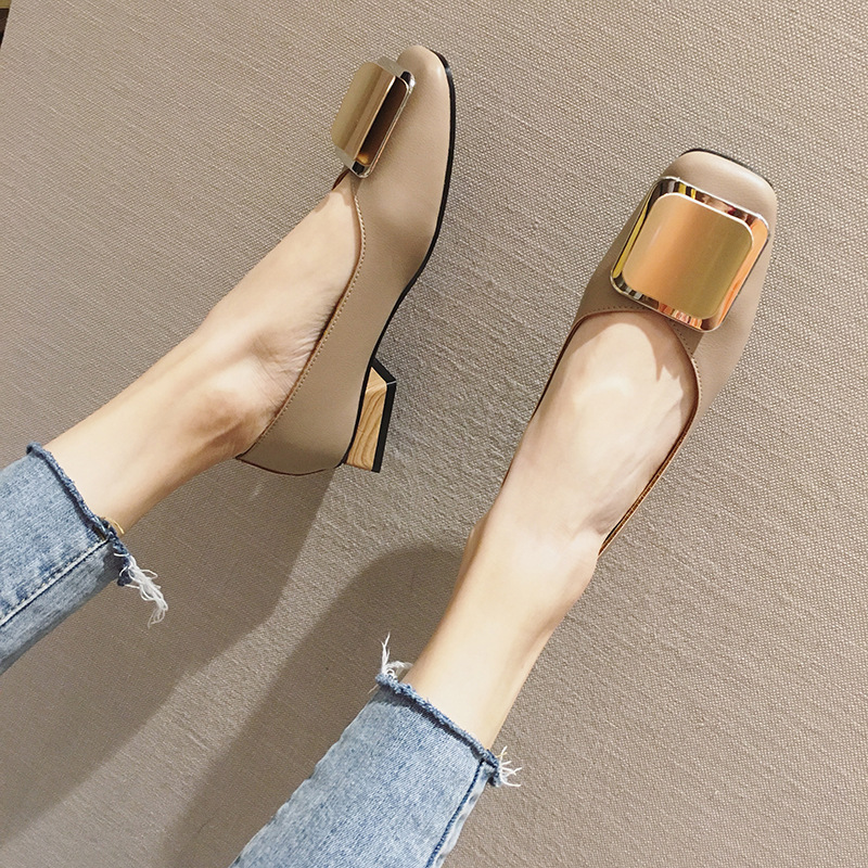 正韓版型純色粗跟中跟淺口瑪麗珍鞋秋季新款大碼女跟鞋豆豆鞋