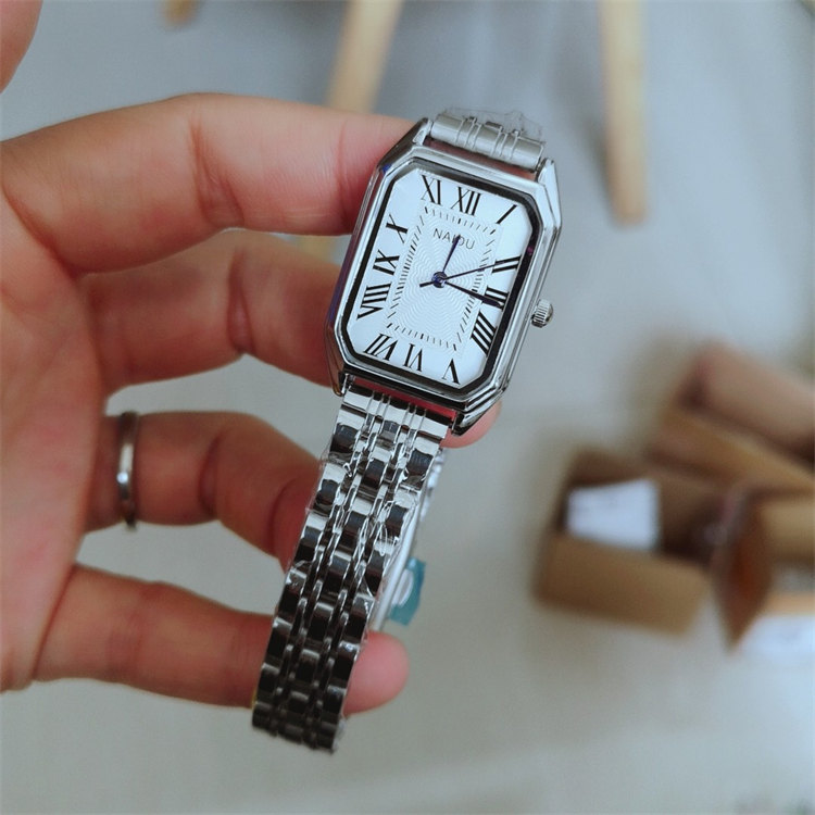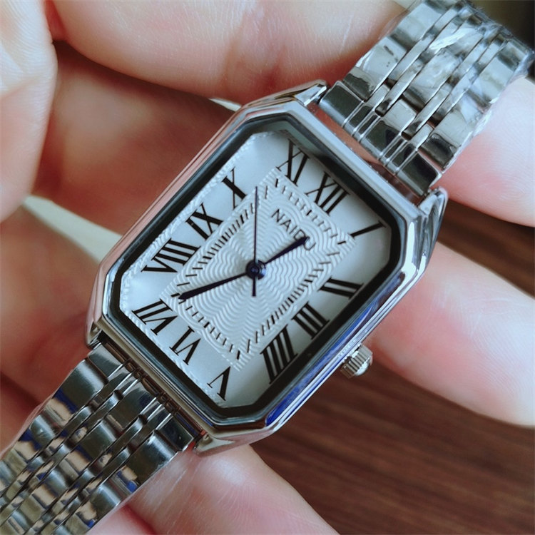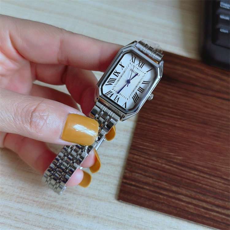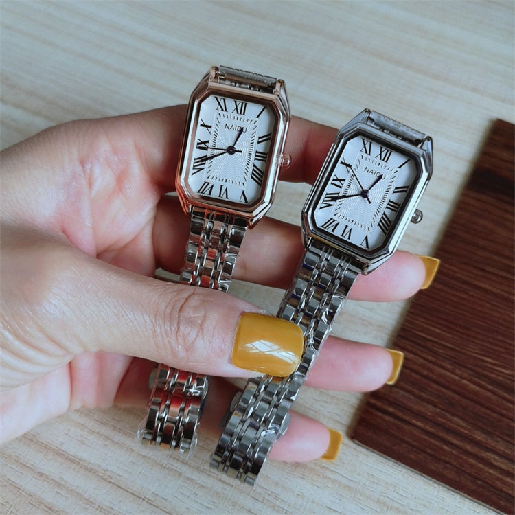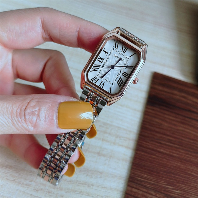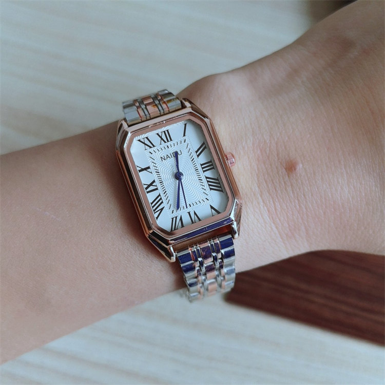 NAIDU超顯氣質長方形錶盤羅馬刻度玫金鋼帶女石英手錶