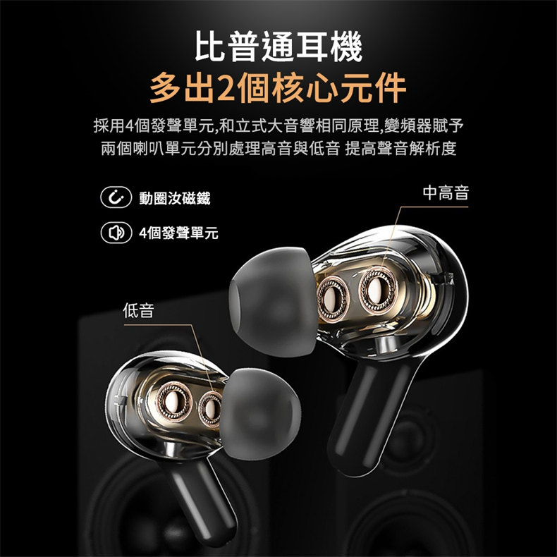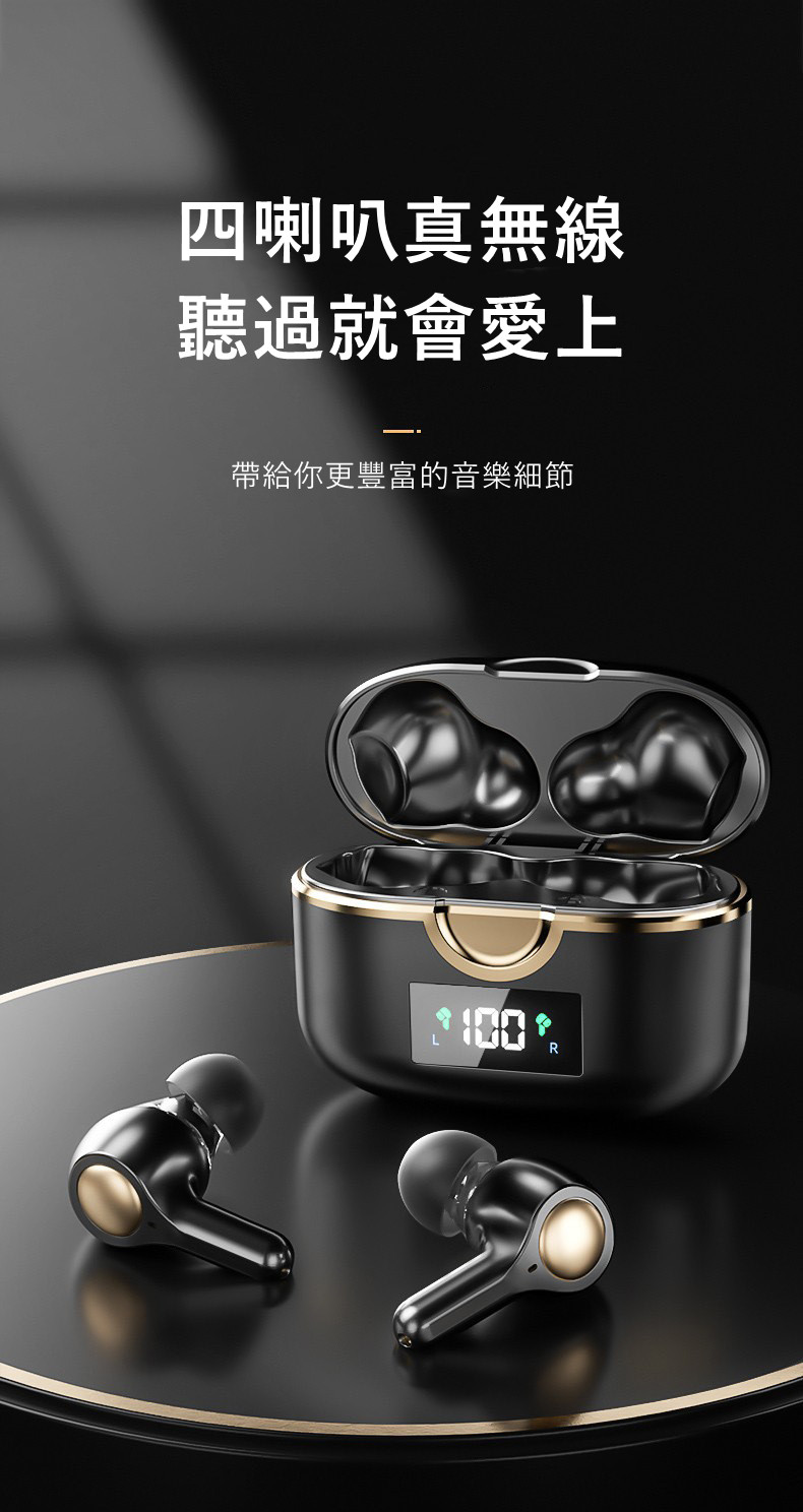 聽過就愛上 | 四喇叭雙單元超動聽 | 真高清降噪通話 | 智慧指紋觸控 | LED電量顯示 | 影院級聽覺盛宴四喇叭雙動圈高清降噪真無線藍芽耳機