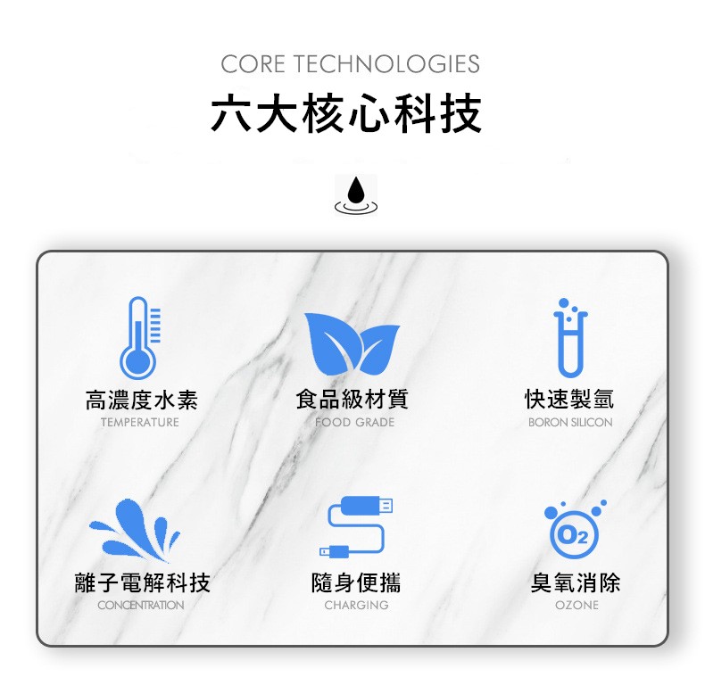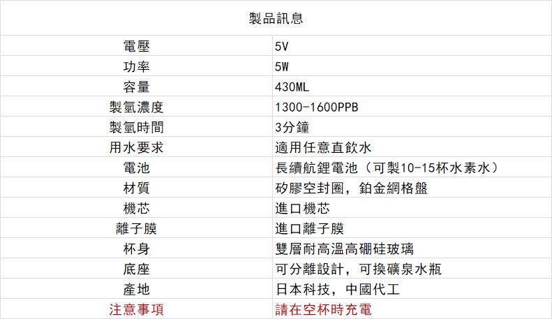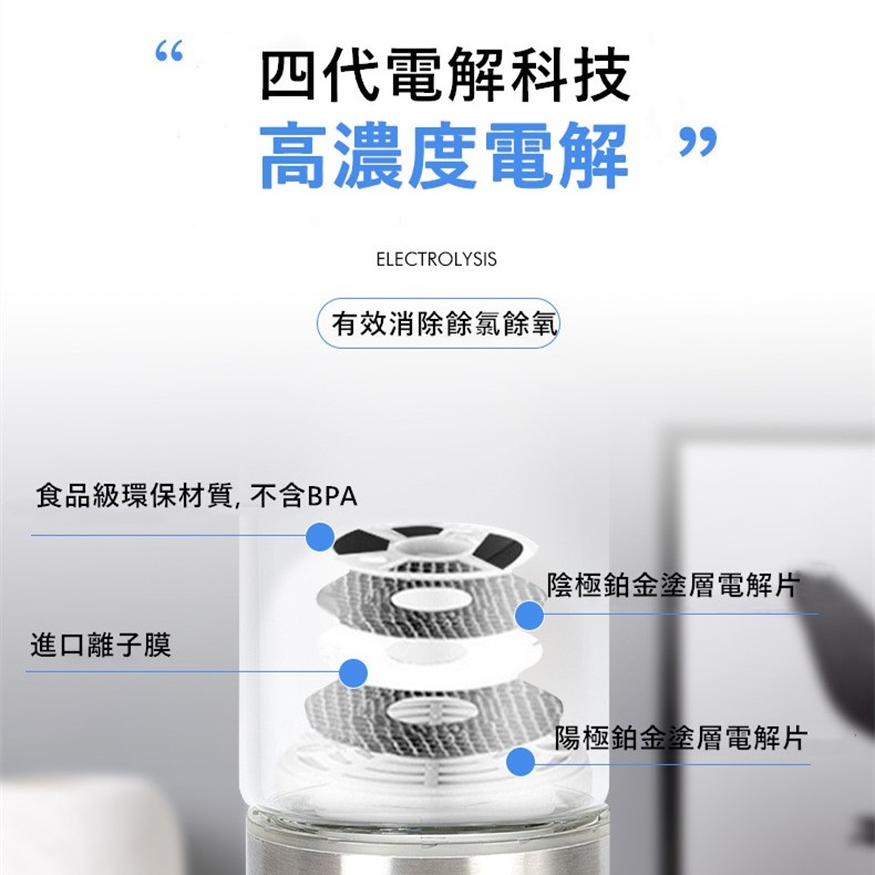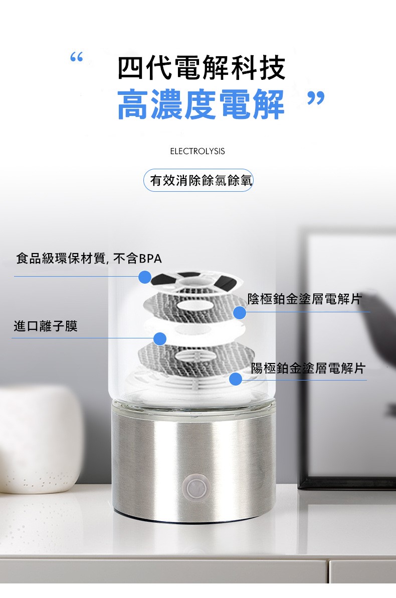 ★六大核心科技,高濃度水素,抗氧化自由基 ★全食品級材質,安全環保健康無憂 ★三分鐘快速高效製氫,無需等待 ★四代離子電解科技,無餘氯,無餘氧 ★大容量鋰電持久續航,可連續製10-15杯水素水 ★高硼硅耐熱玻璃,科技鈦銀杯身 ★現在下單結賬再折100,超高CP值