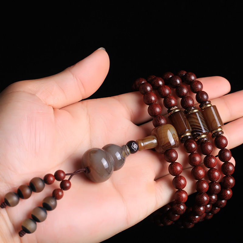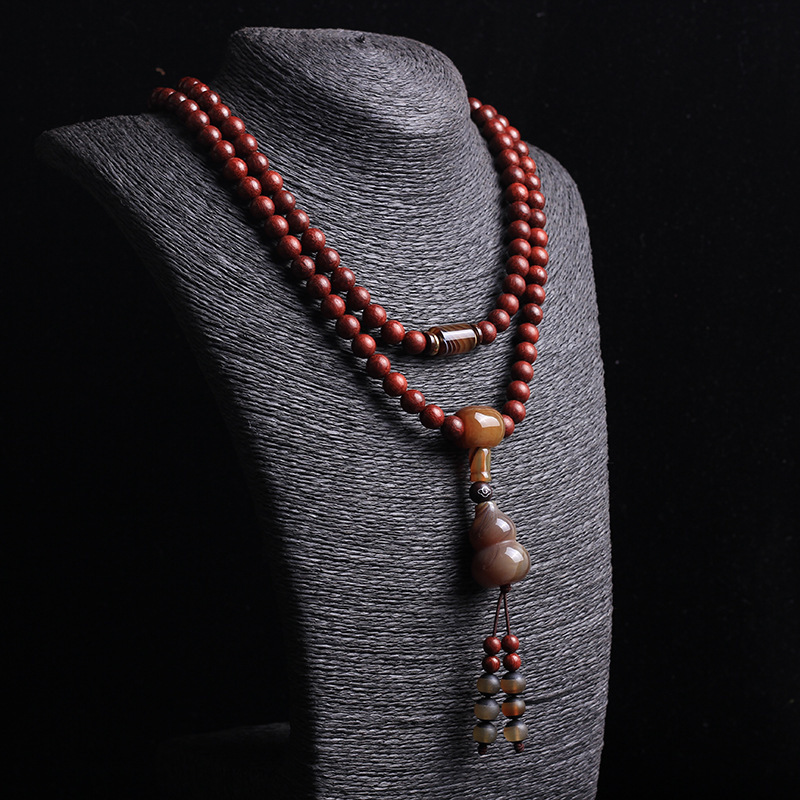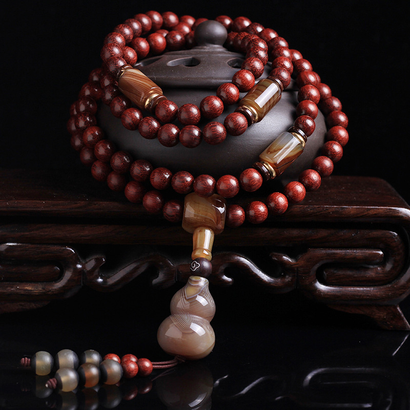 【極品雞血紅小葉紫檀108顆念珠】【纏絲瑪瑙配飾】原創手作極品高油潤雞血紅印度小葉紫檀配纏絲瑪瑙葫蘆佛珠手串