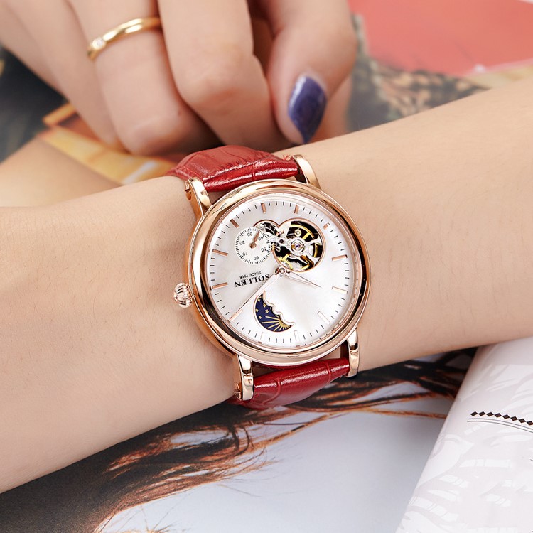 【萬元級全自動機械錶】【月相顯示】【獨立小秒盤】【防水】瑞士SOLLEN日月星辰小牛皮錶帶防水全自動機械女神腕錶
