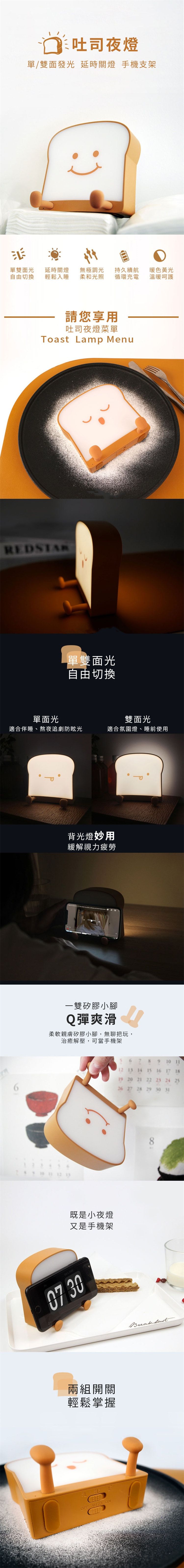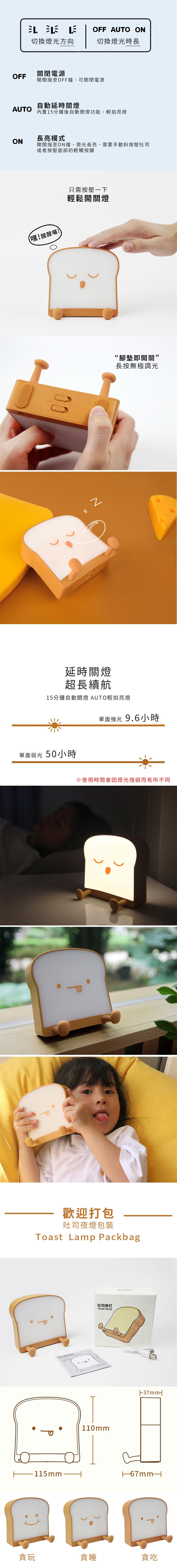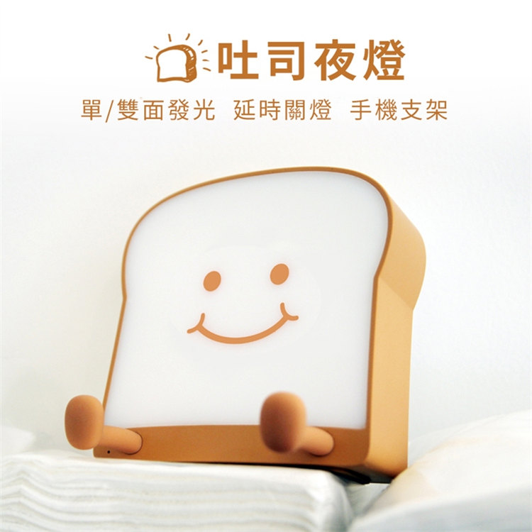 超萌吐司造型夜燈 | 無極調光 | 延時關燈伴睡 | 雙面發光 | 可做手機支架 | USB充插兩用 | 50小時續航 | 超萌可愛吐司麵包造型溫柔伴睡小夜燈