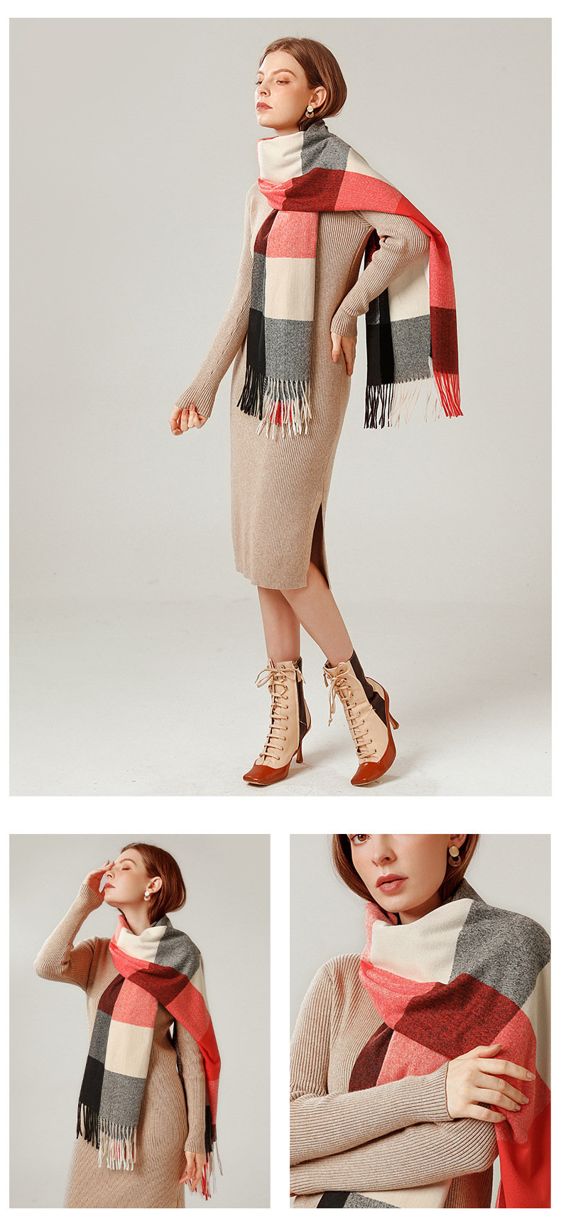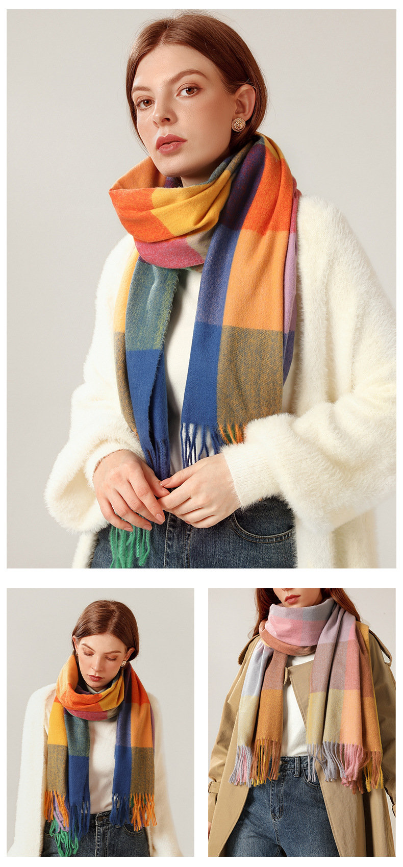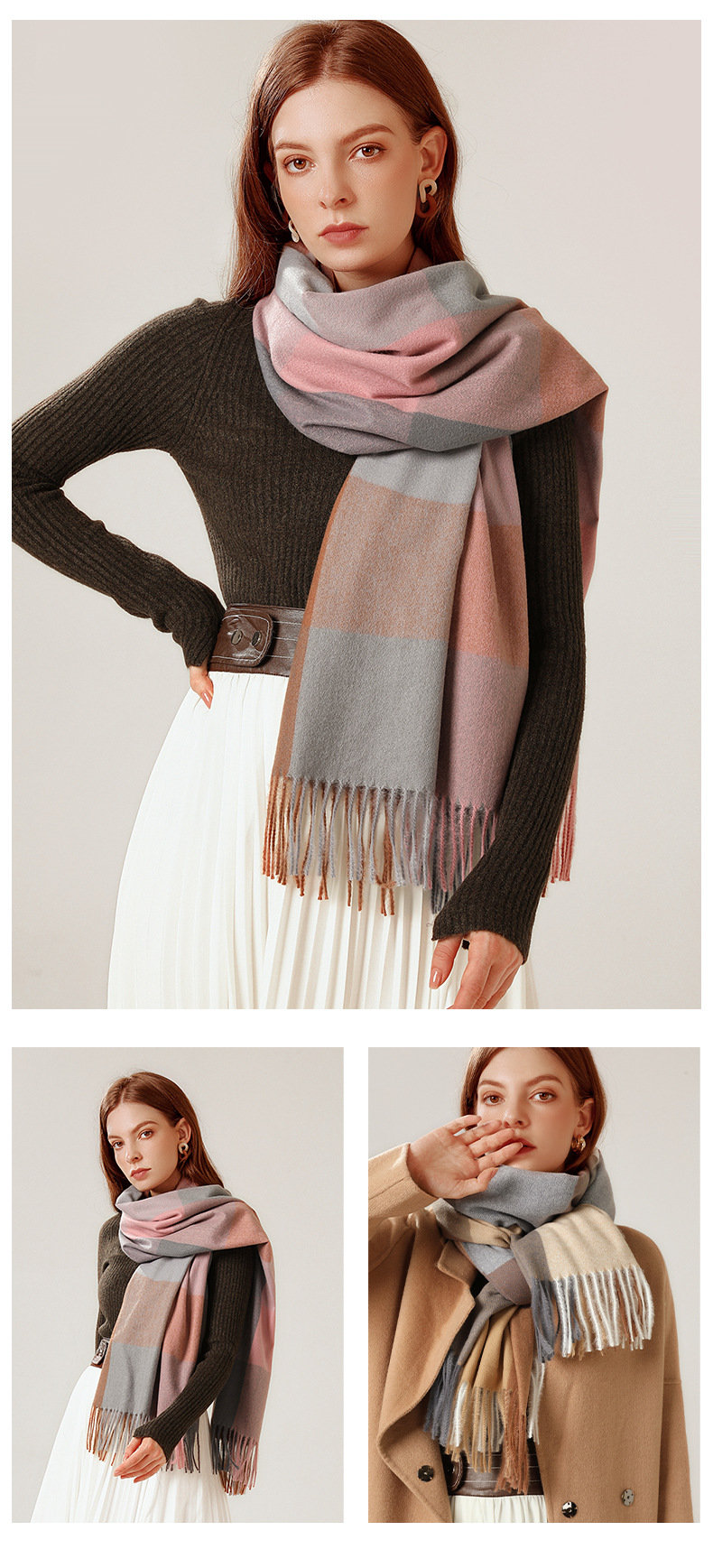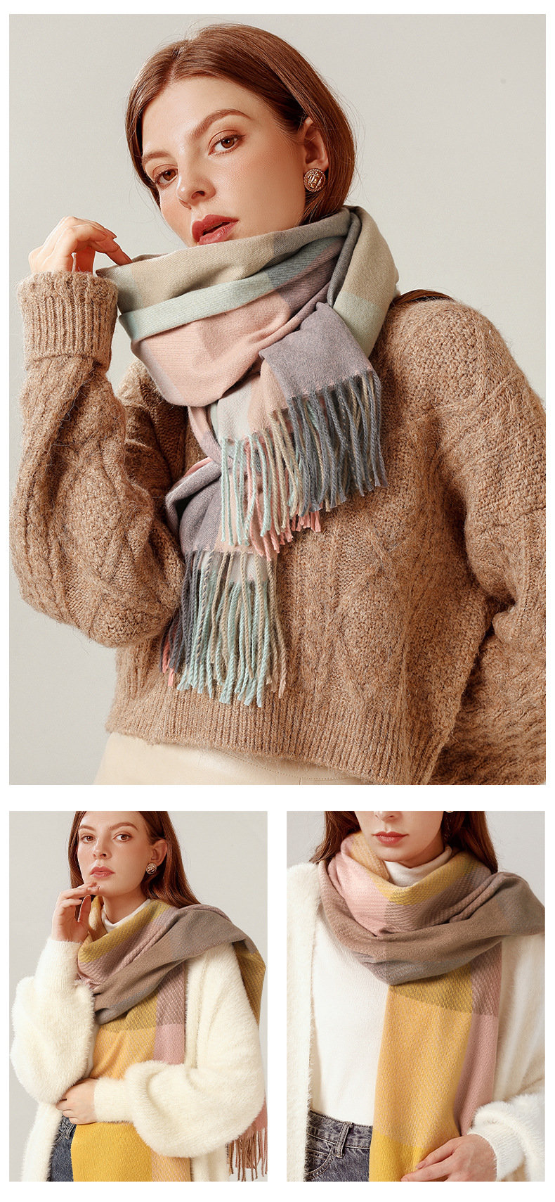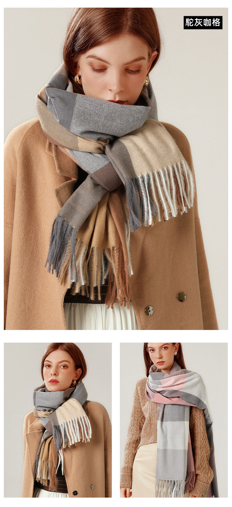 經典不敗英倫方格 | 科技蓄熱軟黃金復合面料 | 軟糯親膚 | 英倫經典中方格羊絨天絲長絨棉復合手感不掉毛蓄熱保暖男女披肩圍脖圍巾