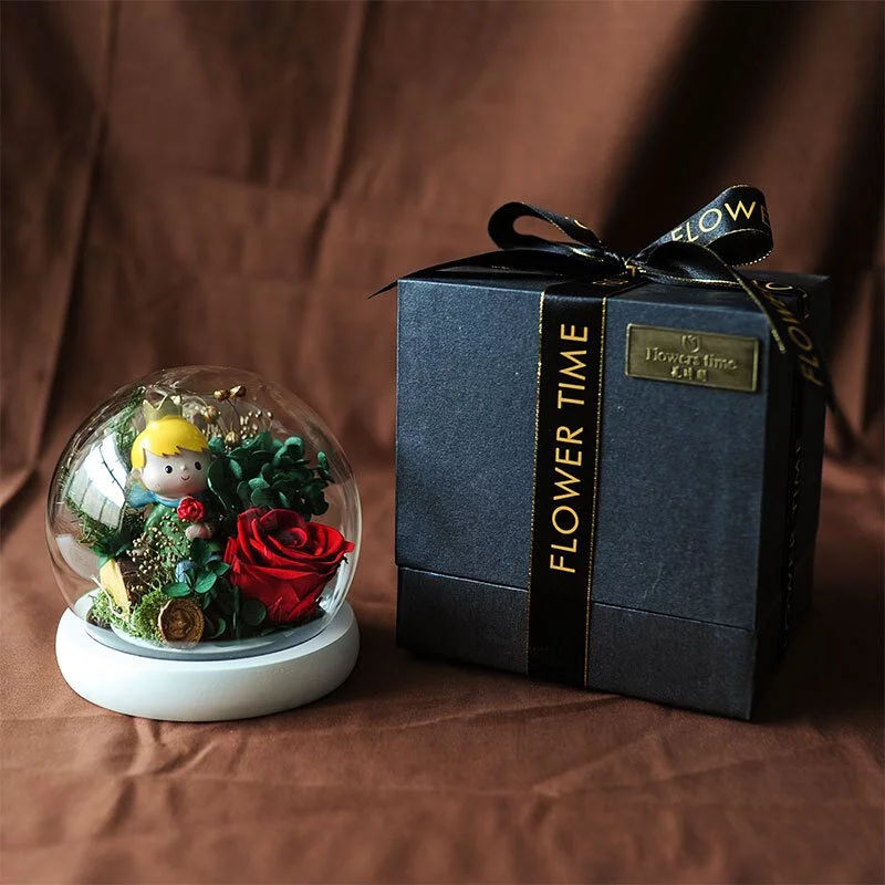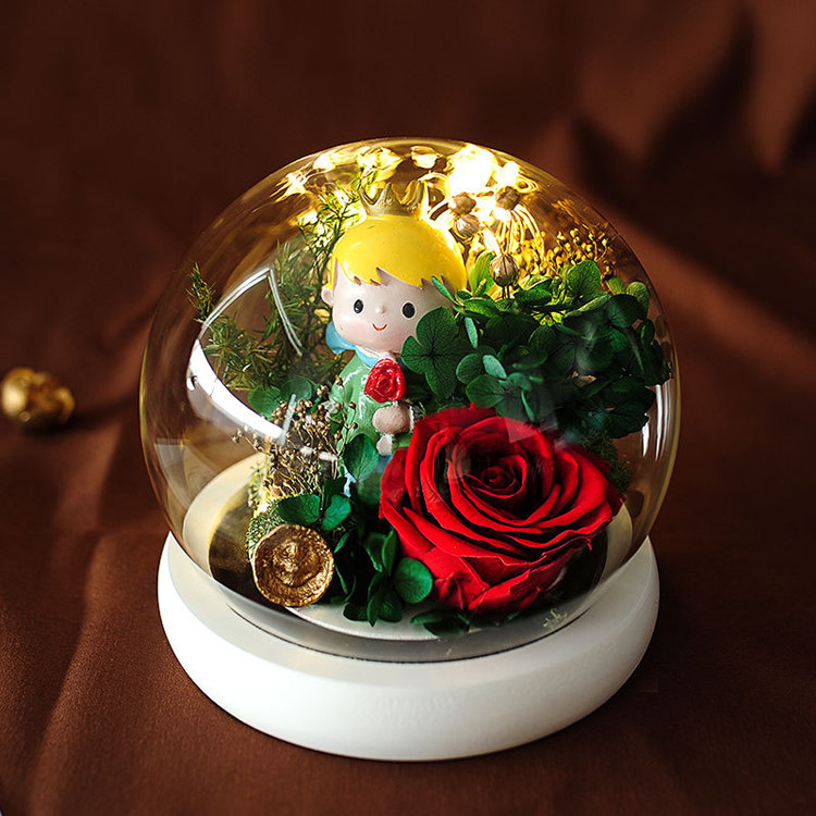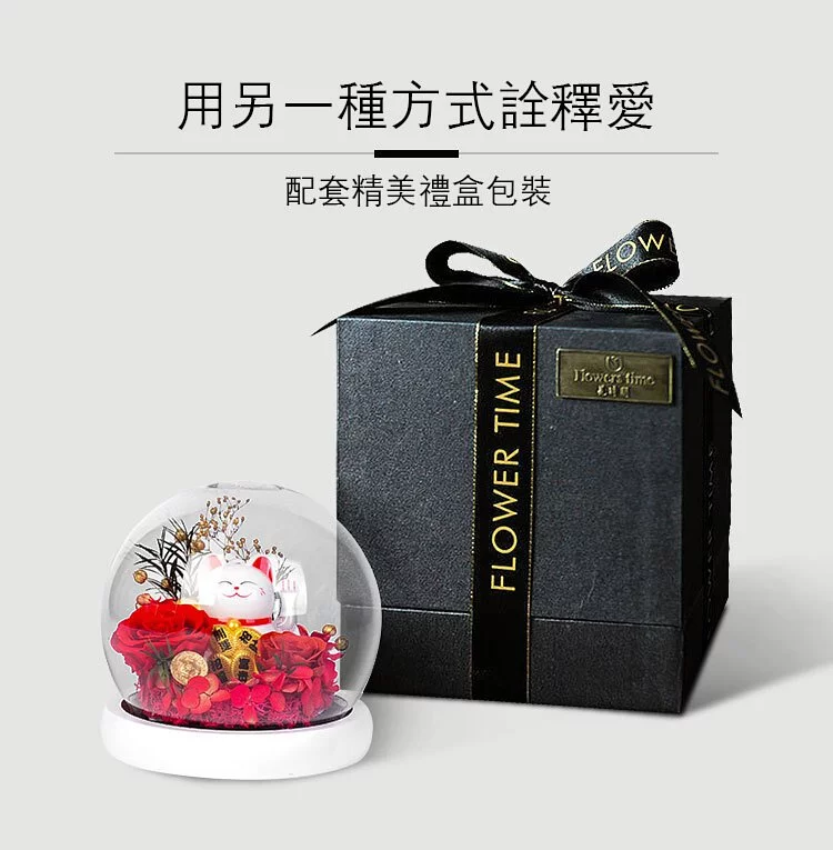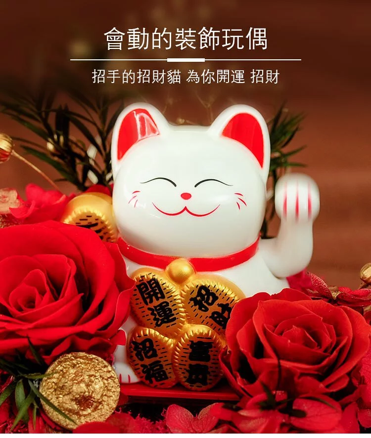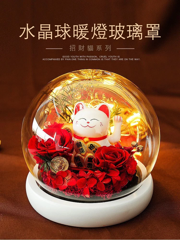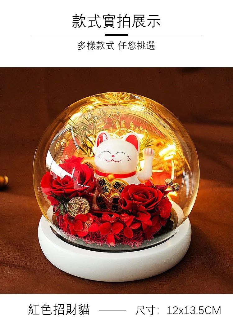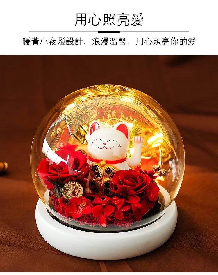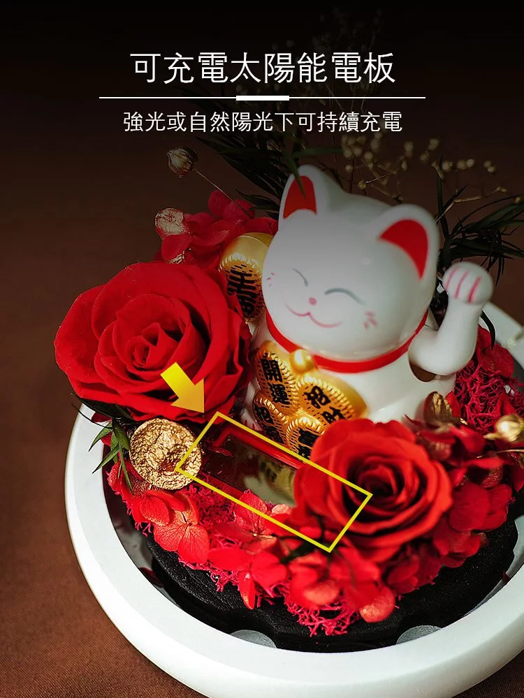 厄瓜多爾永生玫瑰招財貓禮盒 | 太陽能驅動搖手 | 超讚開業禮物 | 夢幻情境會搖手的招財貓永生玫瑰玻璃水晶燈盅禮盒