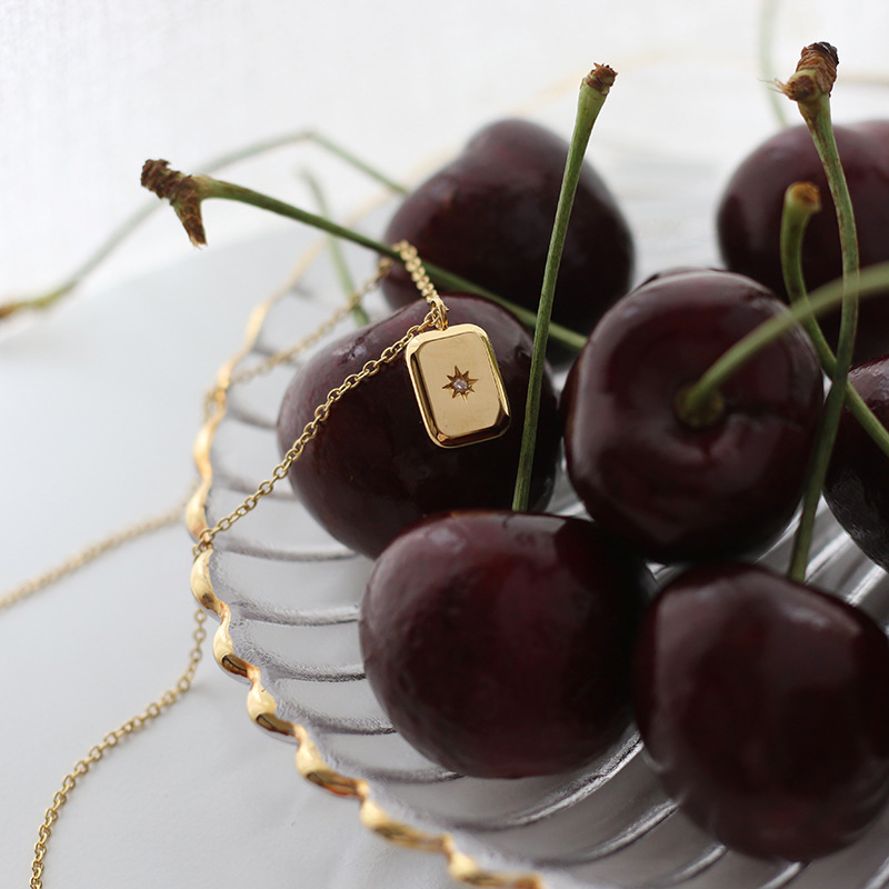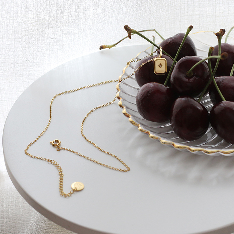 巴黎法國自制立體水滴八芒星寶石方磚鎖骨鍊鈦鋼鍍18K金保色項鍊