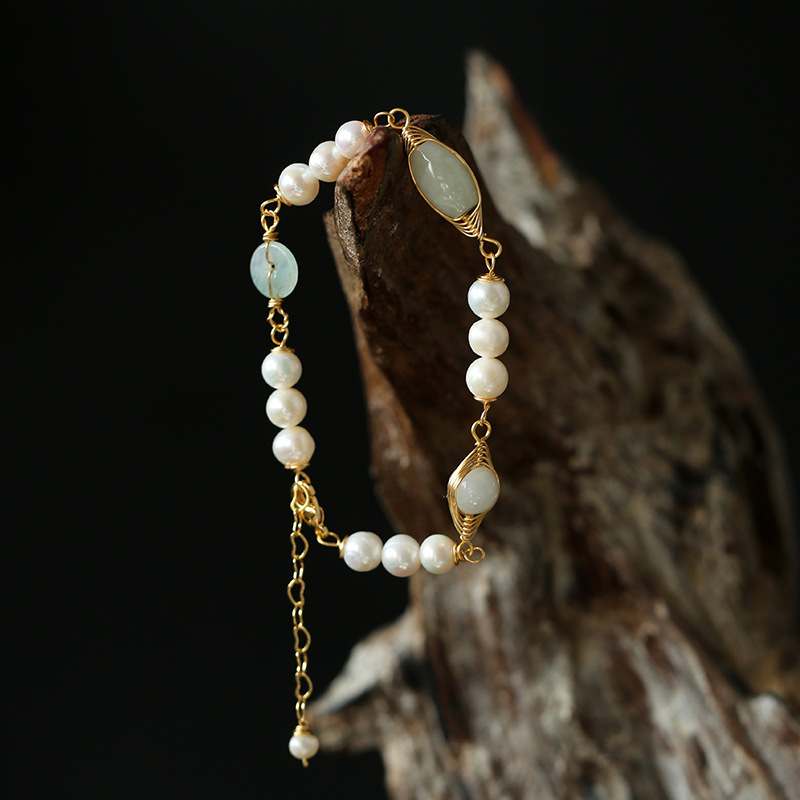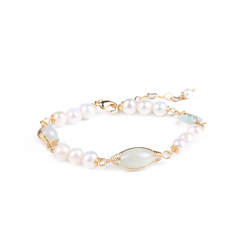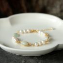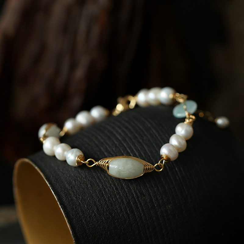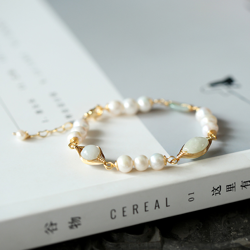 原創設計古風氣質14K包金天然淡水珍珠翡翠繞線手鍊