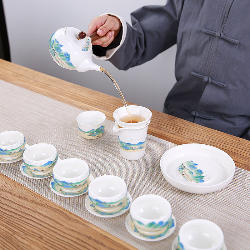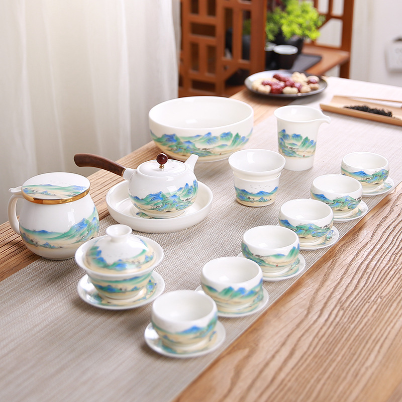 【萬裏江山大全套功夫茶具組】【羊脂玉瓷】頂級精品手工上釉萬裏江山大全套功夫茶具組 (全套組)