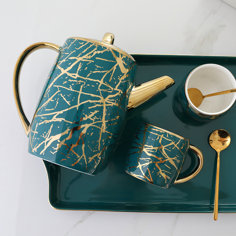 【北歐茶具套組帶茶盤】【大理石紋】北歐氣質大理石紋描金陶瓷茶壺杯勺茶具套組帶茶盤