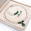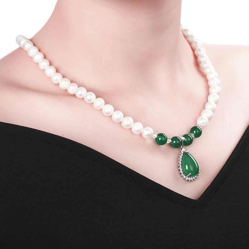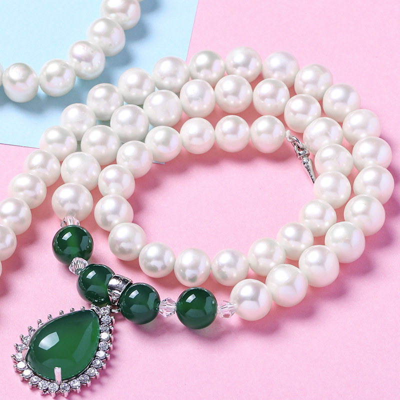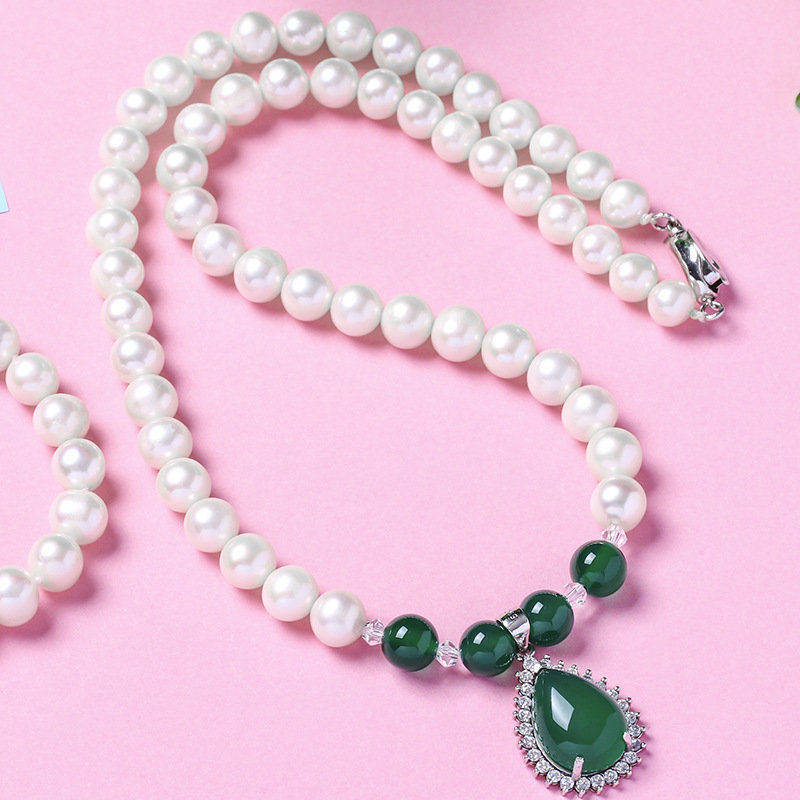 天然珍珠項鍊手鍊耳墜三件組 | 高檔近圓珍珠配帝王綠玉髓 | 925純銀不傷膚 | 母親節禮物送媽媽高檔珍珠首飾項鍊三件組禮盒