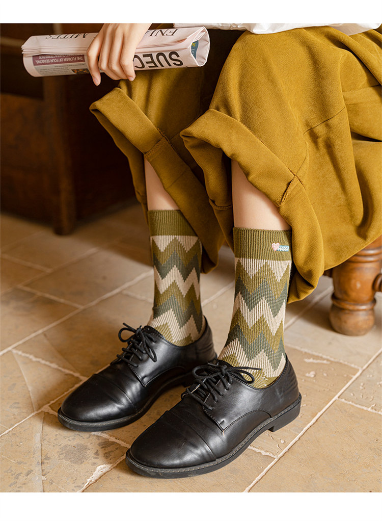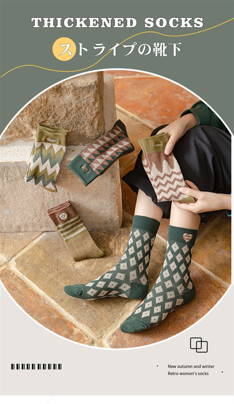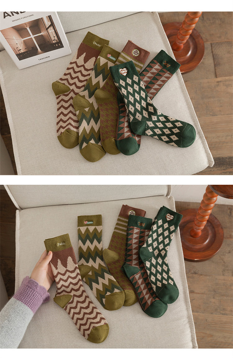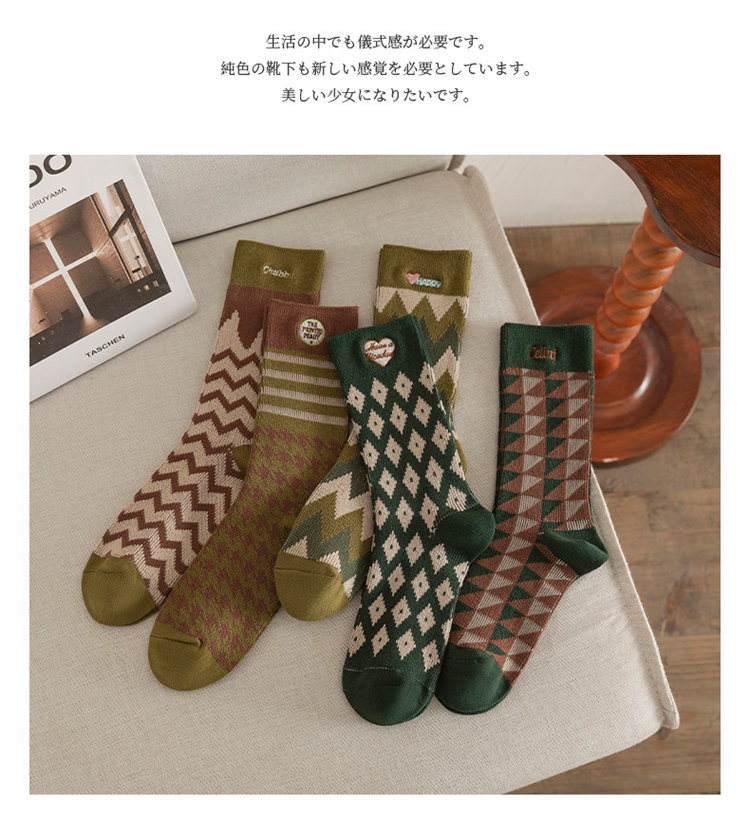 超值混色五雙入 | 軟糯親膚舒適不勒 | 加固耐磨耐洗滌 | 透氣防臭 | 秋冬復古奶茶色系復古條紋波點清新除臭高筒保暖棉襪女長襪子