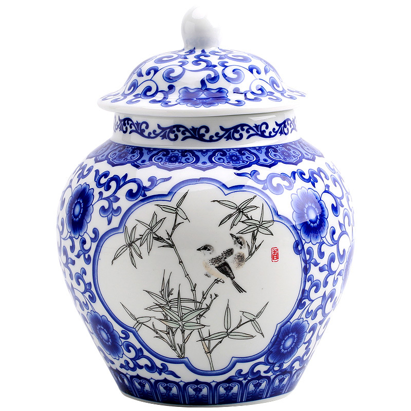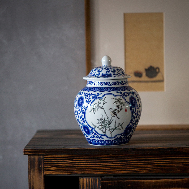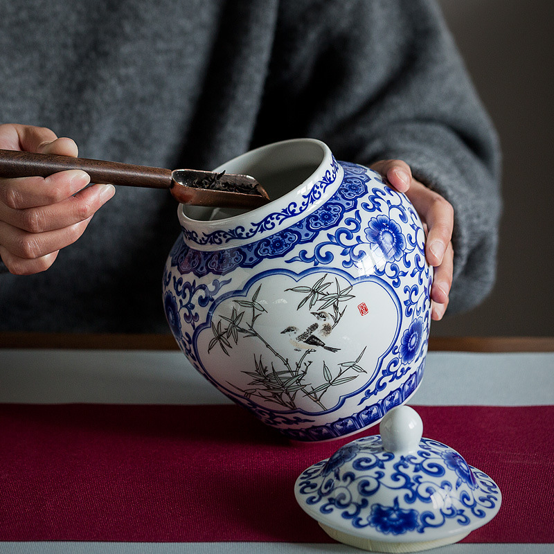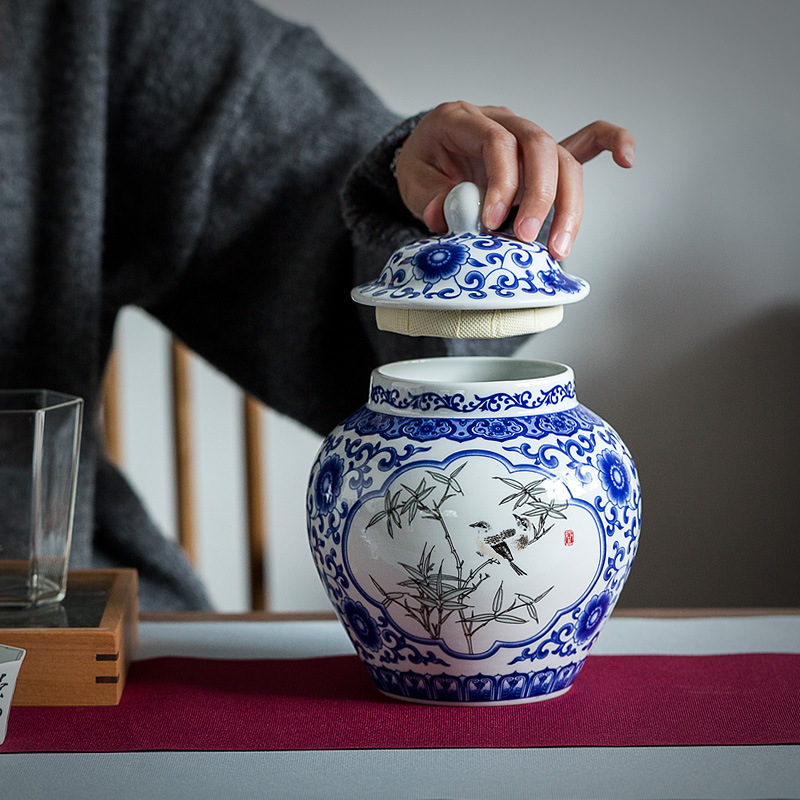 【青花竹鳥】加大號1600ML古風手繪竹鳥青花瓷密封茶葉罐帶布袋禮盒組 (青花瓷)