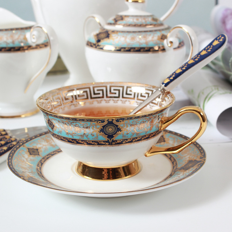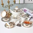【歐式宮廷茶具套組】【描金骨瓷】高檔歐式宮廷手繪花卉骨瓷茶具套組 (1大壺1奶壺1糖罐6杯6碟6勺)