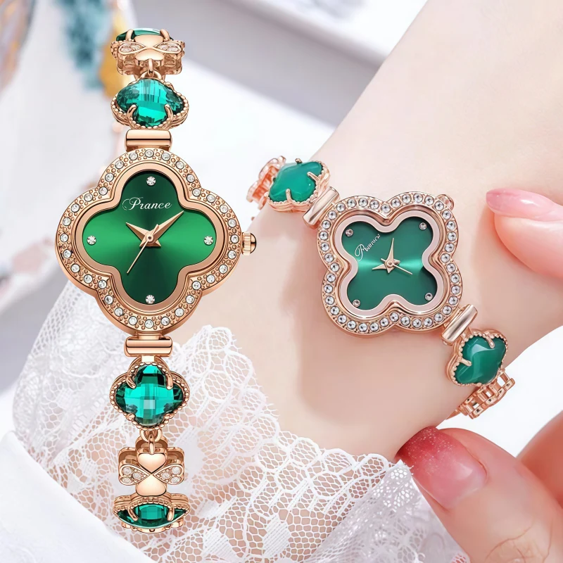 女錶・幸運遇見你 | 四葉草滿鑽錶盤 | 綠水晶玫金錶鍊 | 高級日本石英機芯 | 幸運草滿鑽錶盤綠寶石錶鍊精緻女手錶