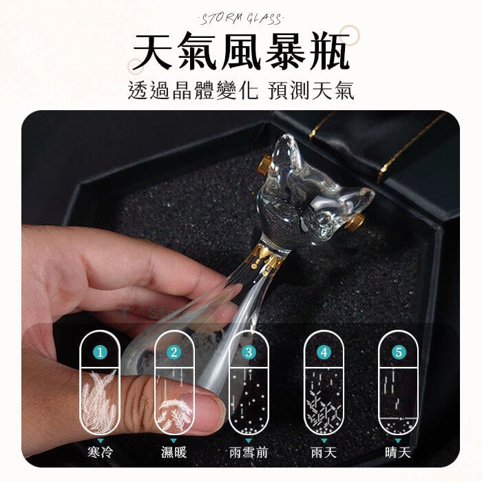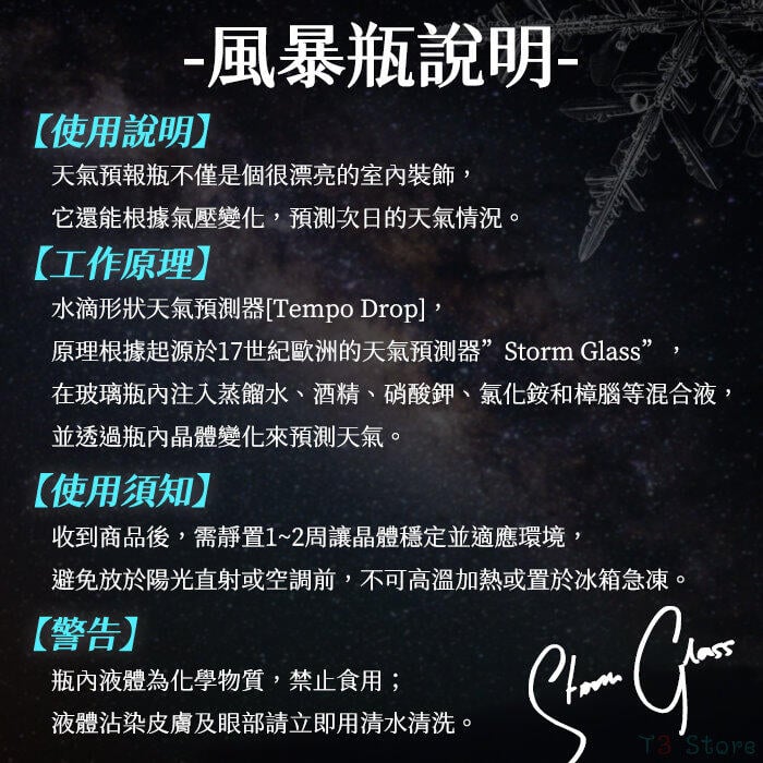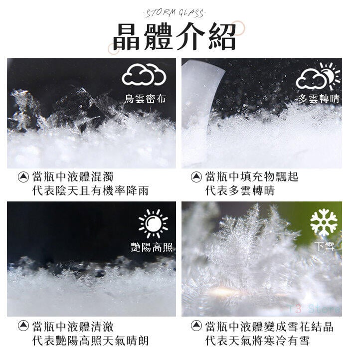 根據外界溫度、天氣的改變,瓶內會展現出不同型態的結晶,預報天氣的變化。
