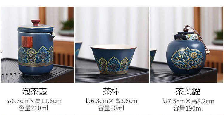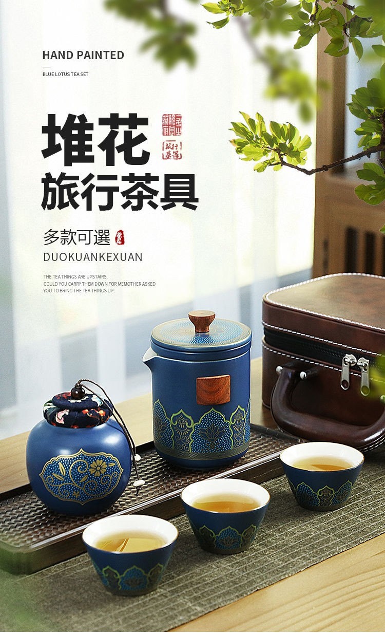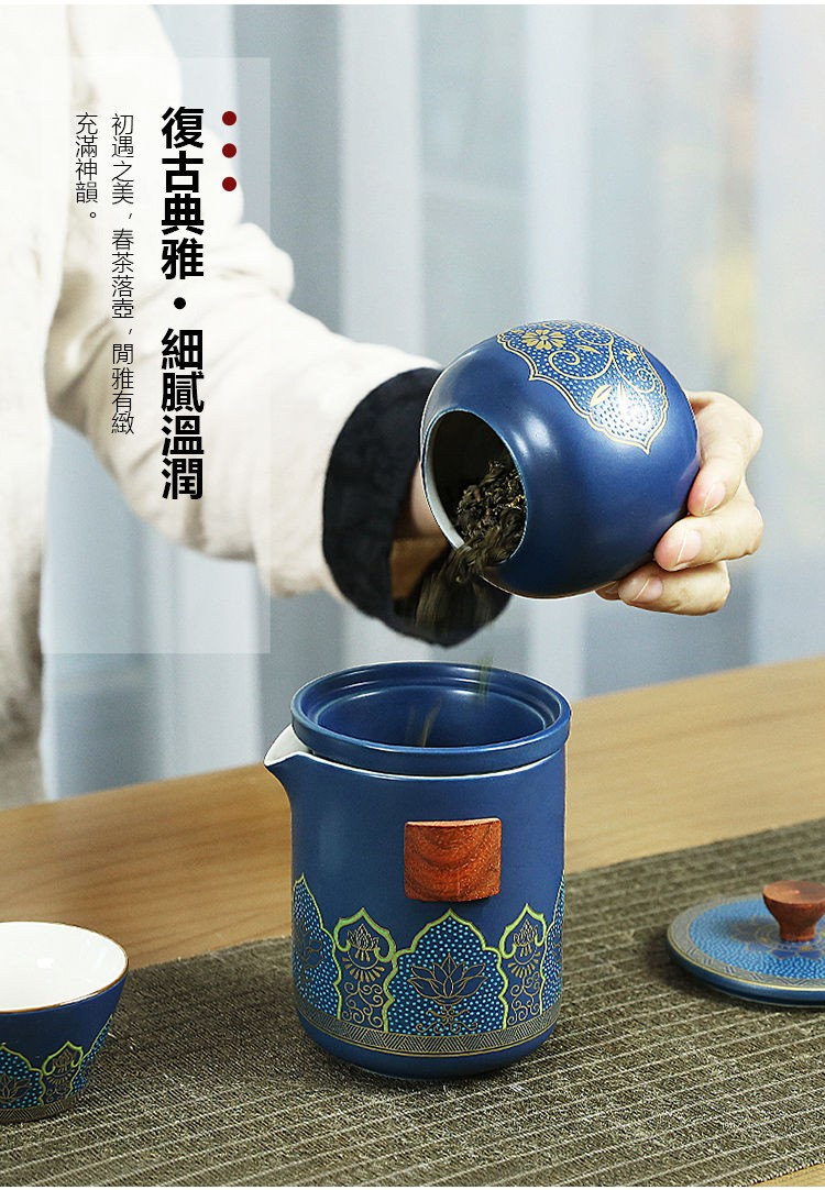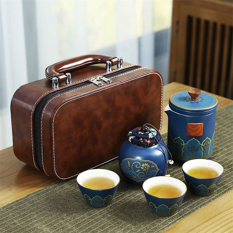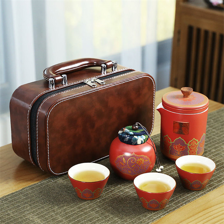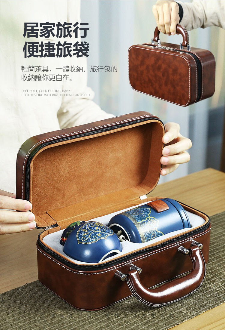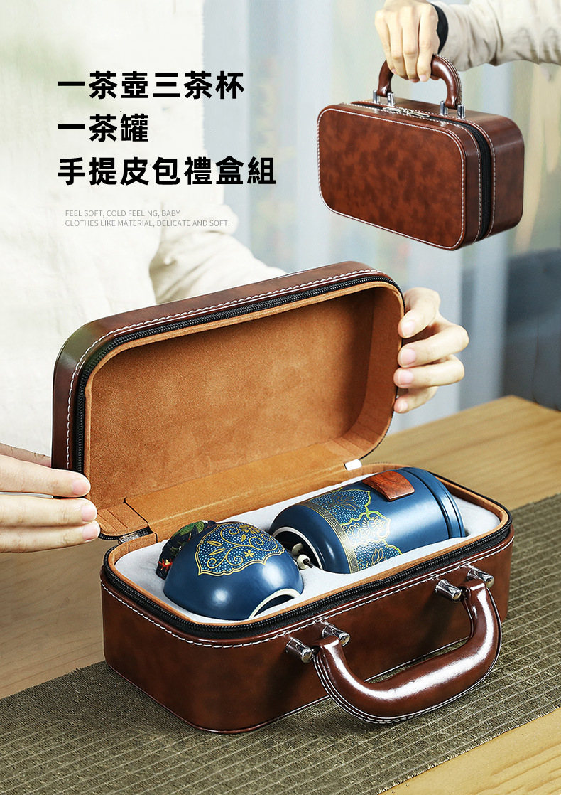 古韻茶香功夫旅行茶具組 | 一壺三杯一茶罐 | 高檔手提皮質禮盒 | 品味送禮送男生送爸爸古韻茶香瓷都原礦陶土堆花功夫茶具手提禮盒組