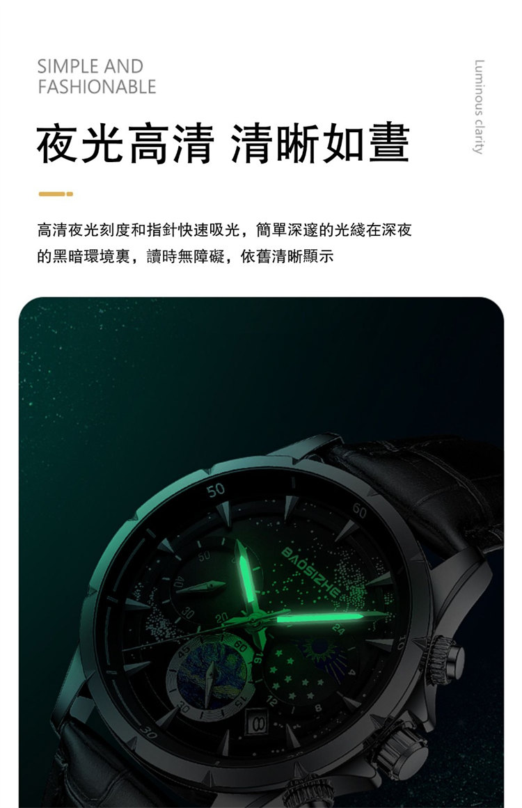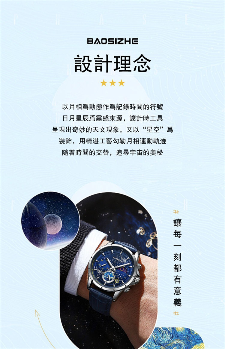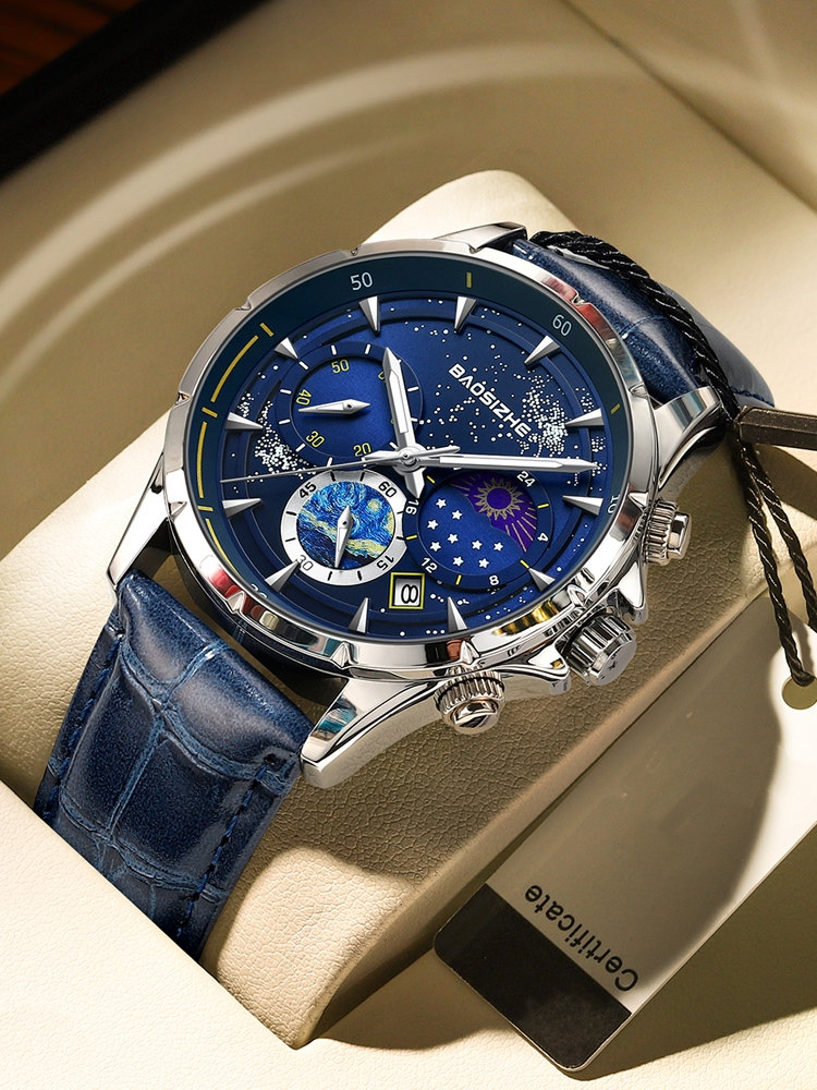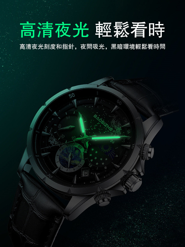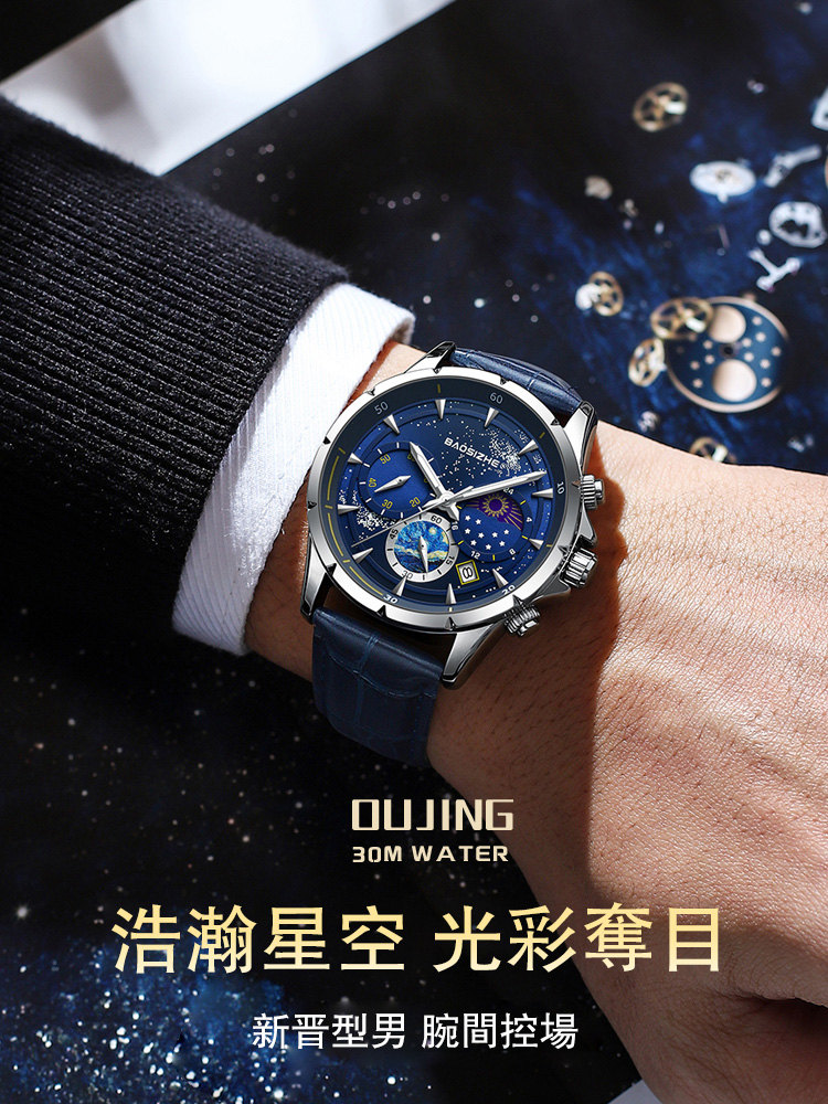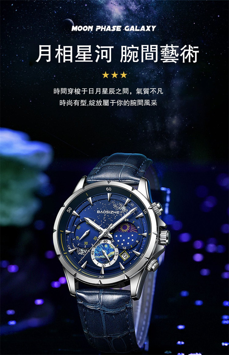 璀璨星河系列腕錶 | 月相星河小錶盤 | 日本星辰機芯 | 30米密封防水 | 高清夜光指針 | 意大利小牛皮錶帶 | BAOSIZHE儒雅紳士璀璨星河男手錶
