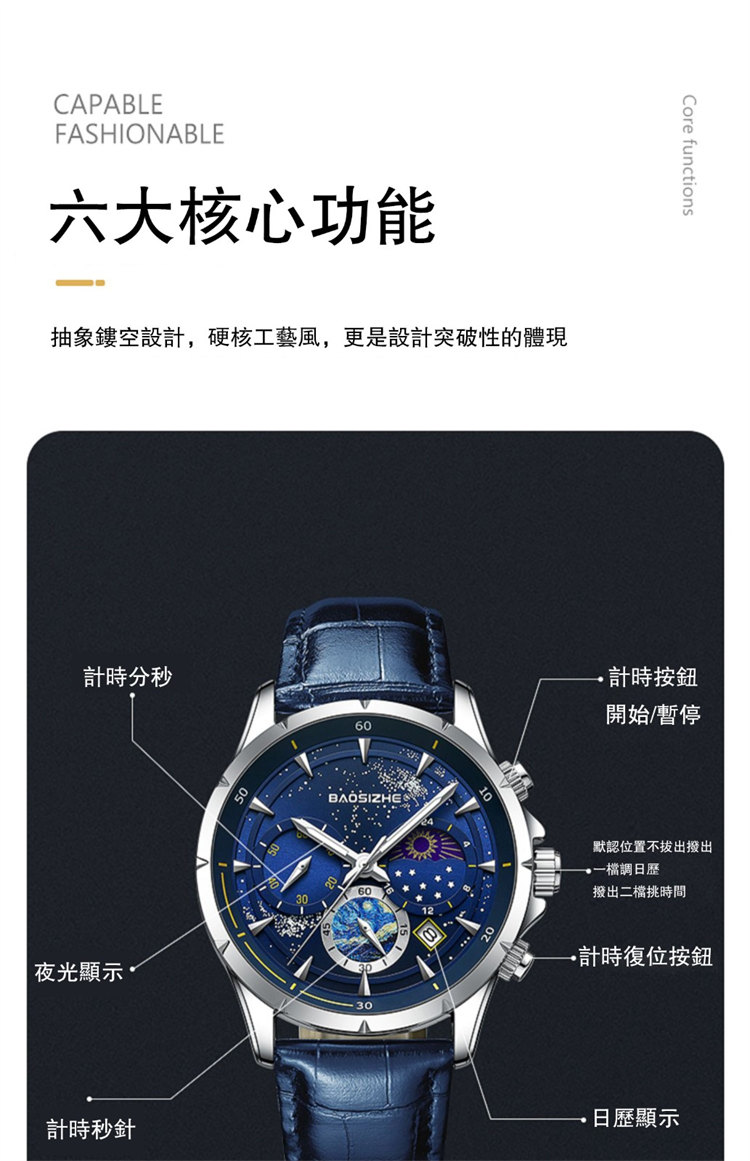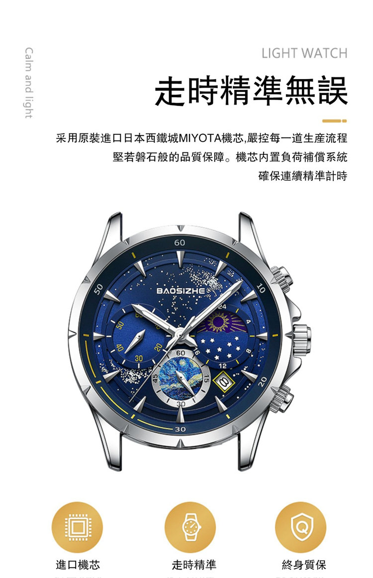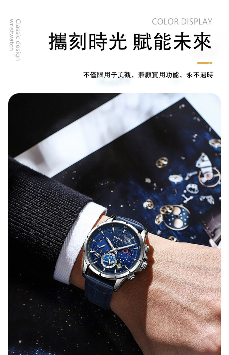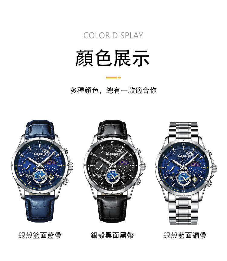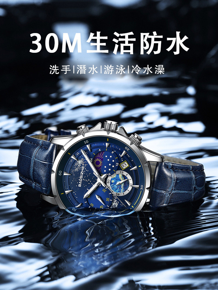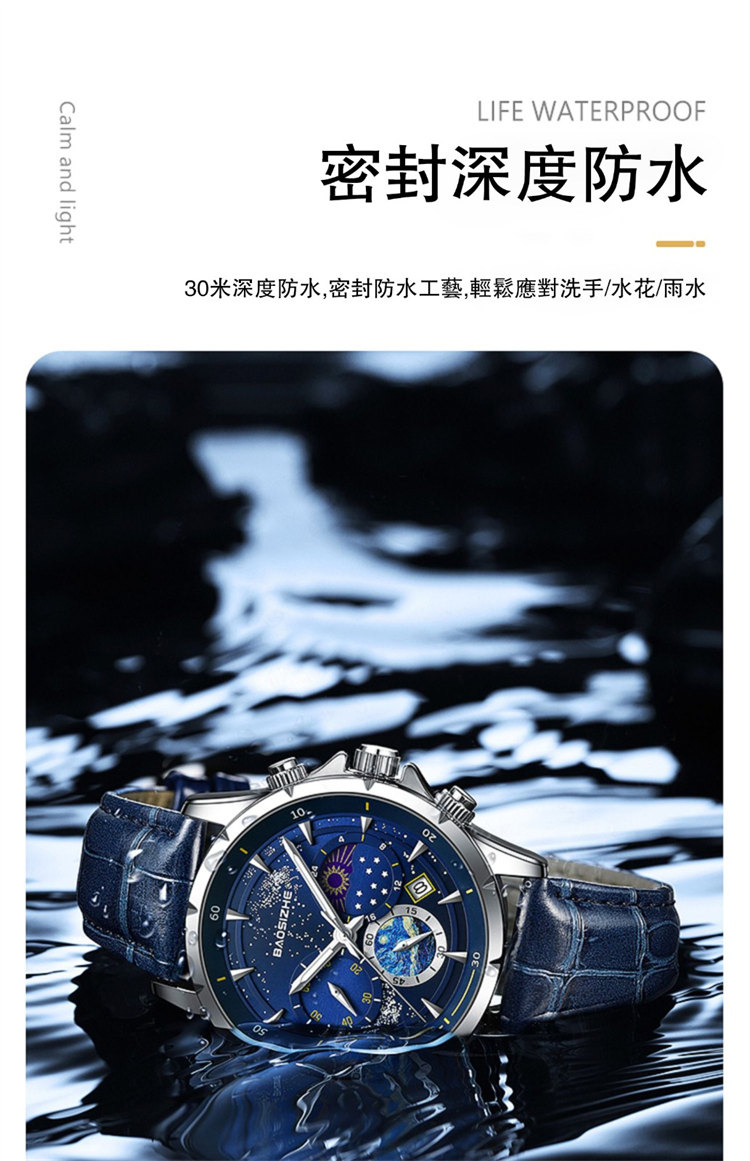 璀璨星河系列腕錶 | 月相星河小錶盤 | 日本星辰機芯 | 30米密封防水 | 高清夜光指針 | 意大利小牛皮錶帶 | BAOSIZHE儒雅紳士璀璨星河男手錶