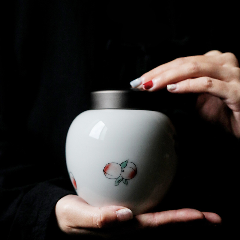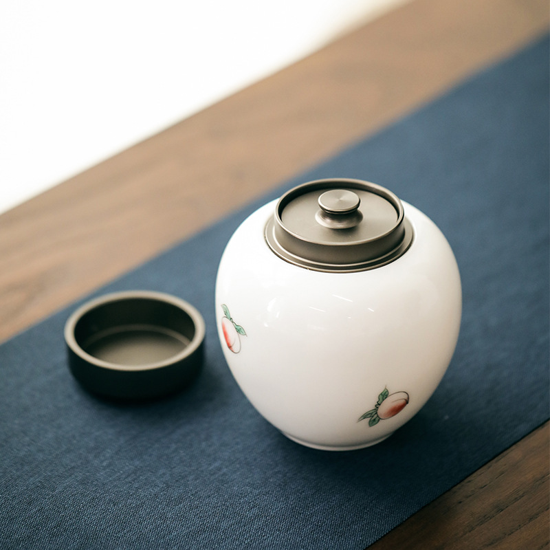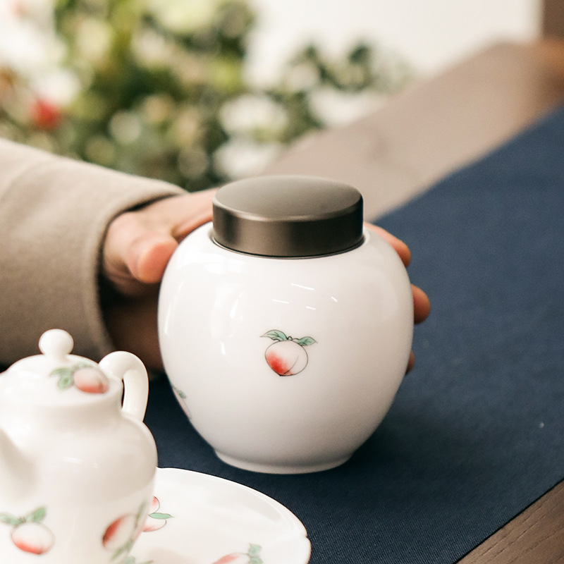 【桃問】【豬油白】【錫蓋】中號日式清雅手繪桃問高檔豬油白瓷錫蓋密封茶葉罐