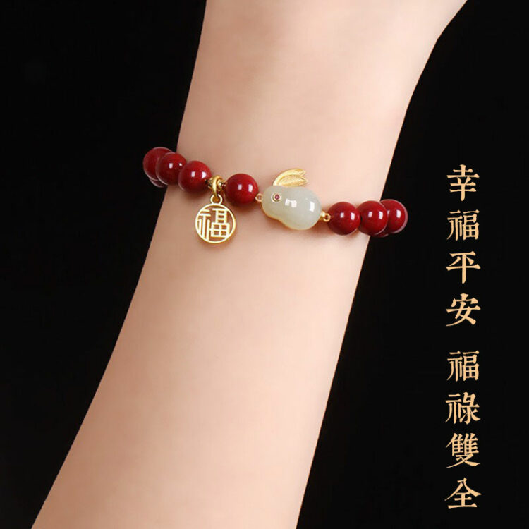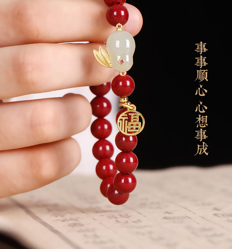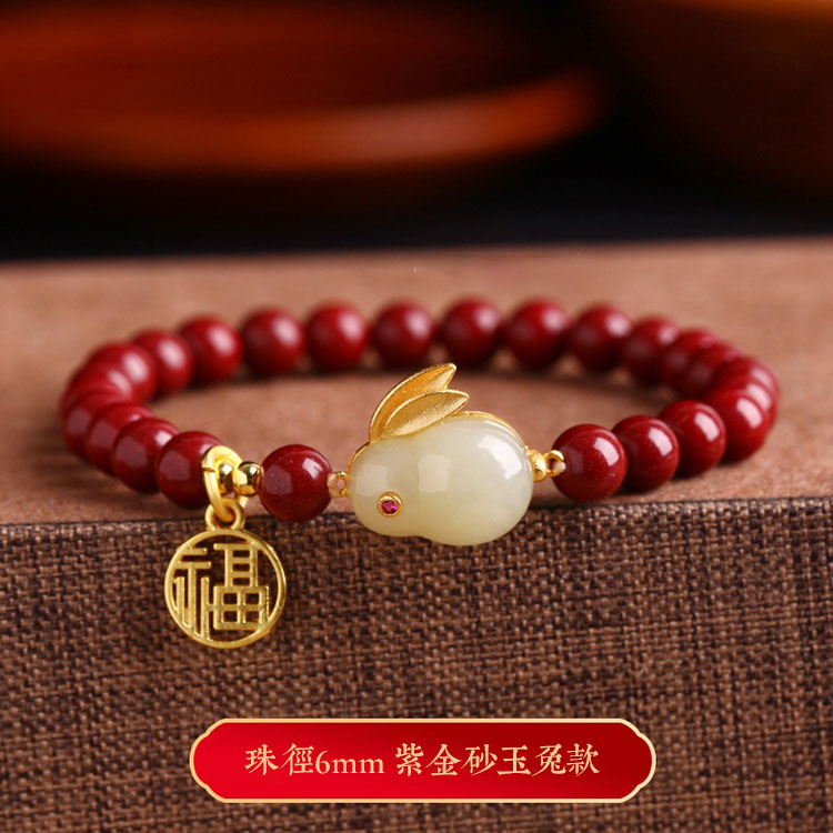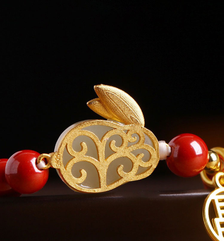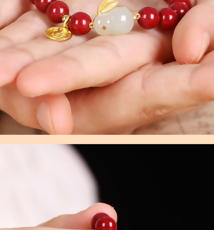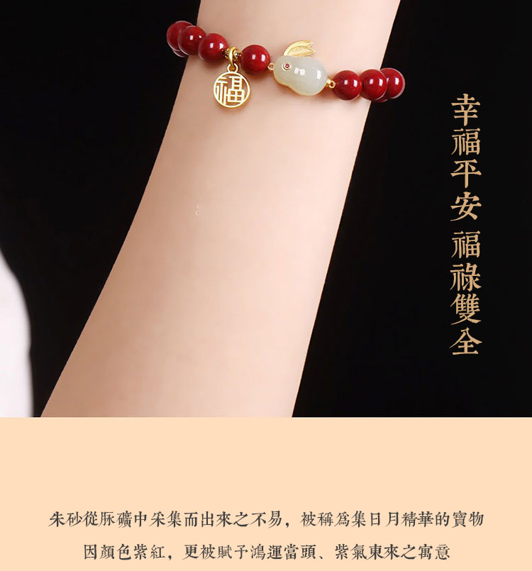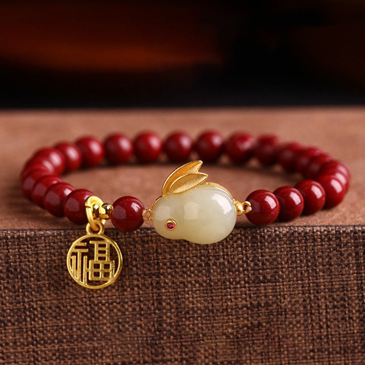 玲瓏玉兔硃砂手鍊 | 天然帝王紫金硃砂 | 天然和田玉 | 925銀鍍金福字牌 | 本命年天然硃砂圓珠配和田玉玲瓏兔硃砂手鍊手串