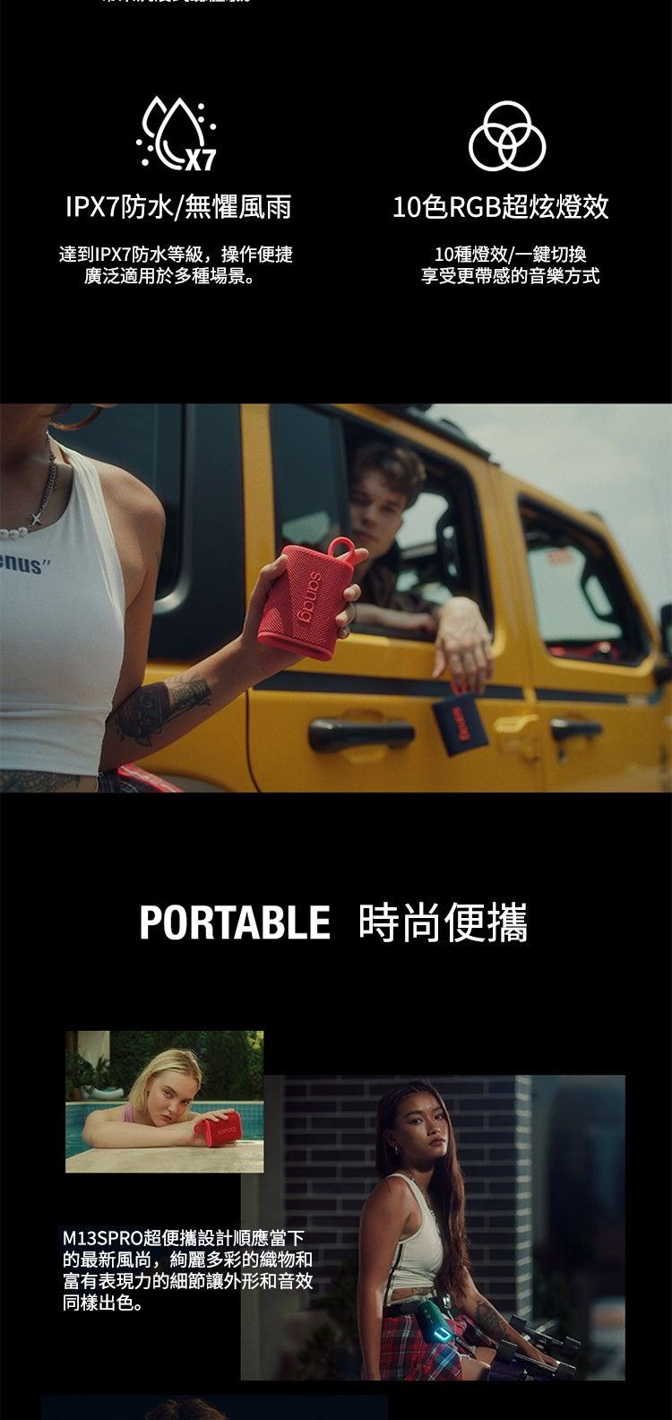 四核發聲 | 高低音復合振膜 | 杜比環繞音效 | RGB超炫燈效 | 全密封腔體IPX7級防水 | 20小時超長續航 | 英國SANAG室內戶外便攜音響無線藍芽喇叭