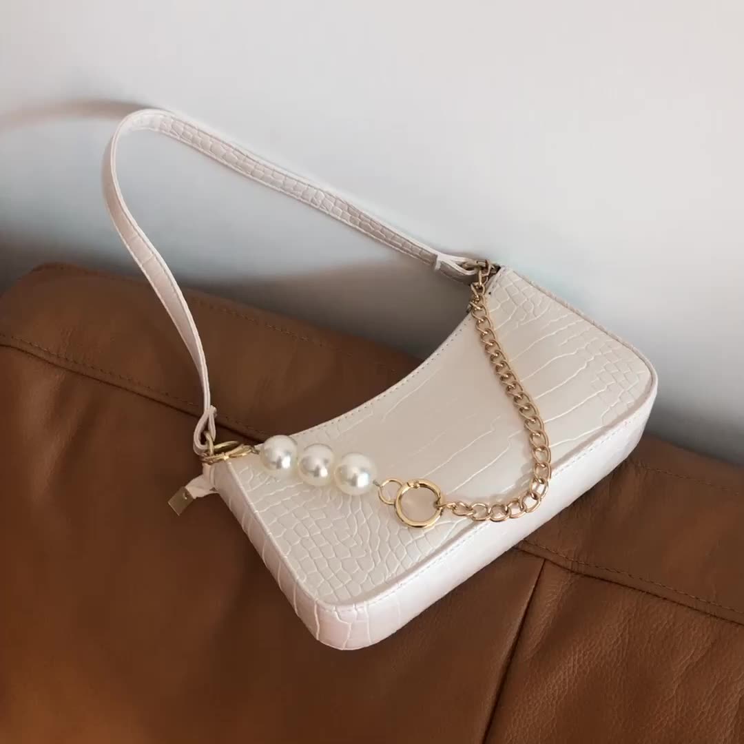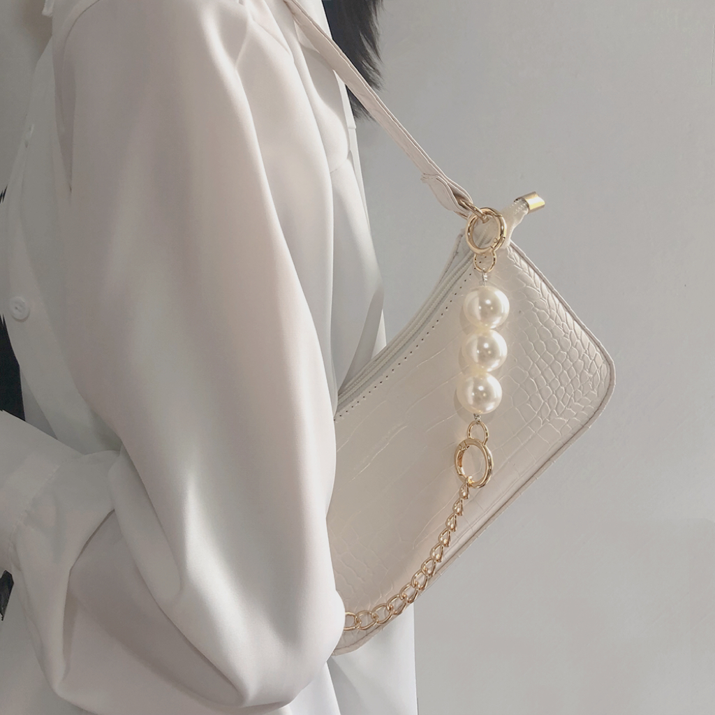新款質感單肩斜挎腋下小包 ins百搭鳄魚紋金色鏈條珍珠法棍包