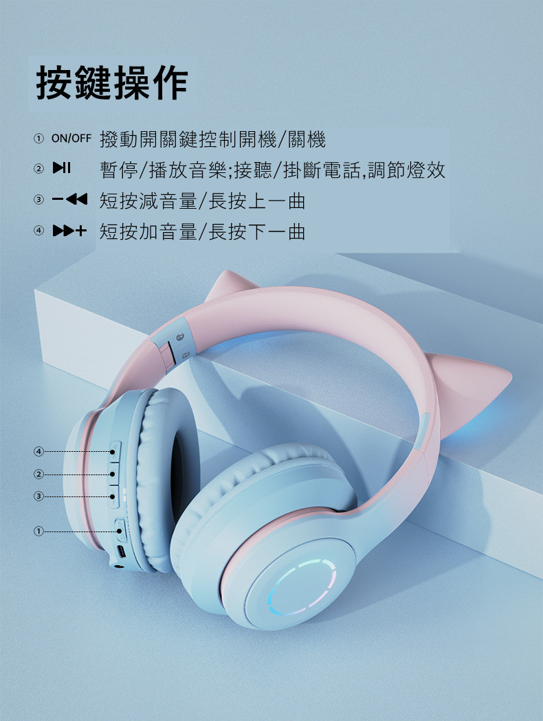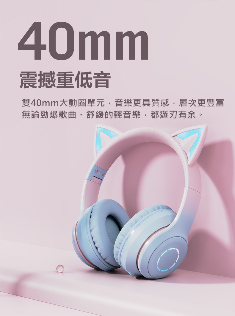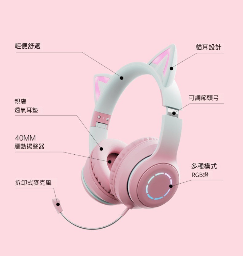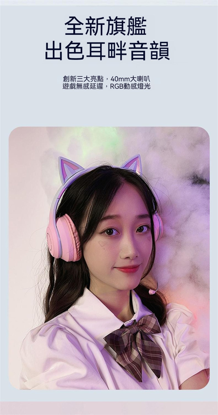 電競女神貓耳無線耳機 | 炫彩LED韻律燈效 | 大動圈澎湃聲場 | 音畫同步無感延遲 | 無線有線雙模式 | 14小時超長續航 | 女神級無線藍牙耳罩式耳機