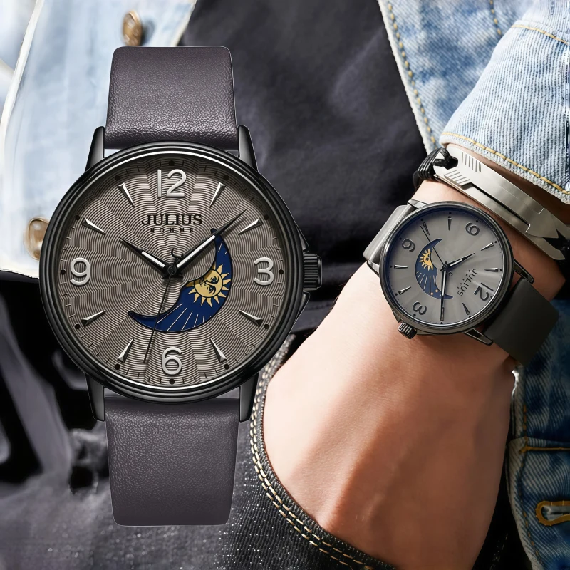 男錶・赫利俄斯之眼 | 鏤空星河月相錶盤 | 日本高級石英機芯 | 小牛皮帶 | 30米防水 | 韓國JULIUS鏤空星河月相高級男士石英手錶