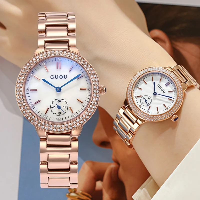女錶・秀場側影 | 奧地利滿圈水鑽 | 獨立小秒盤 | 日本高檔機芯 | 流光玫金鋼帶 | 藍光礦物水晶錶鏡 | GUOU奢級氣質閃鑽玫金女士手錶