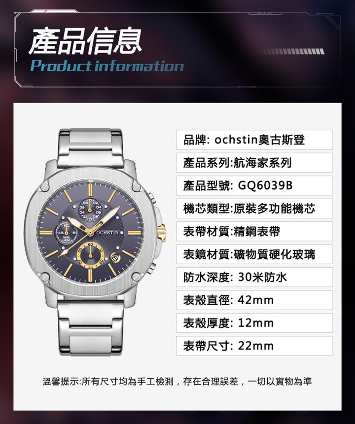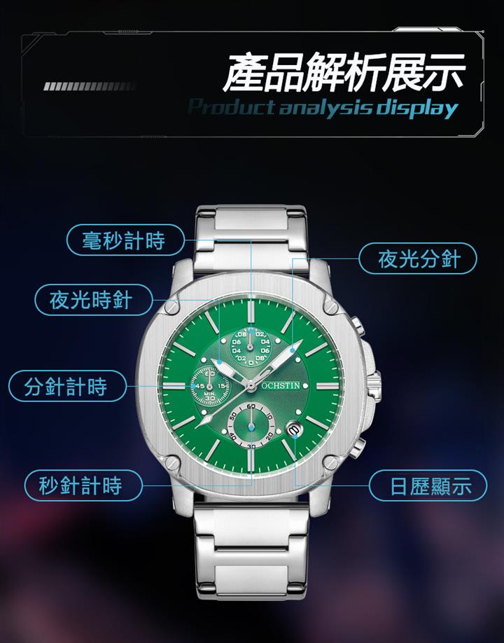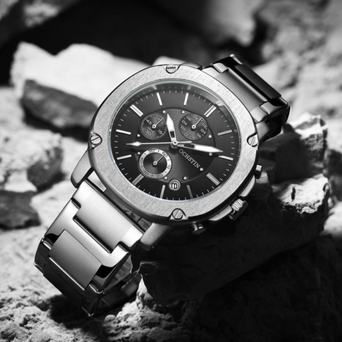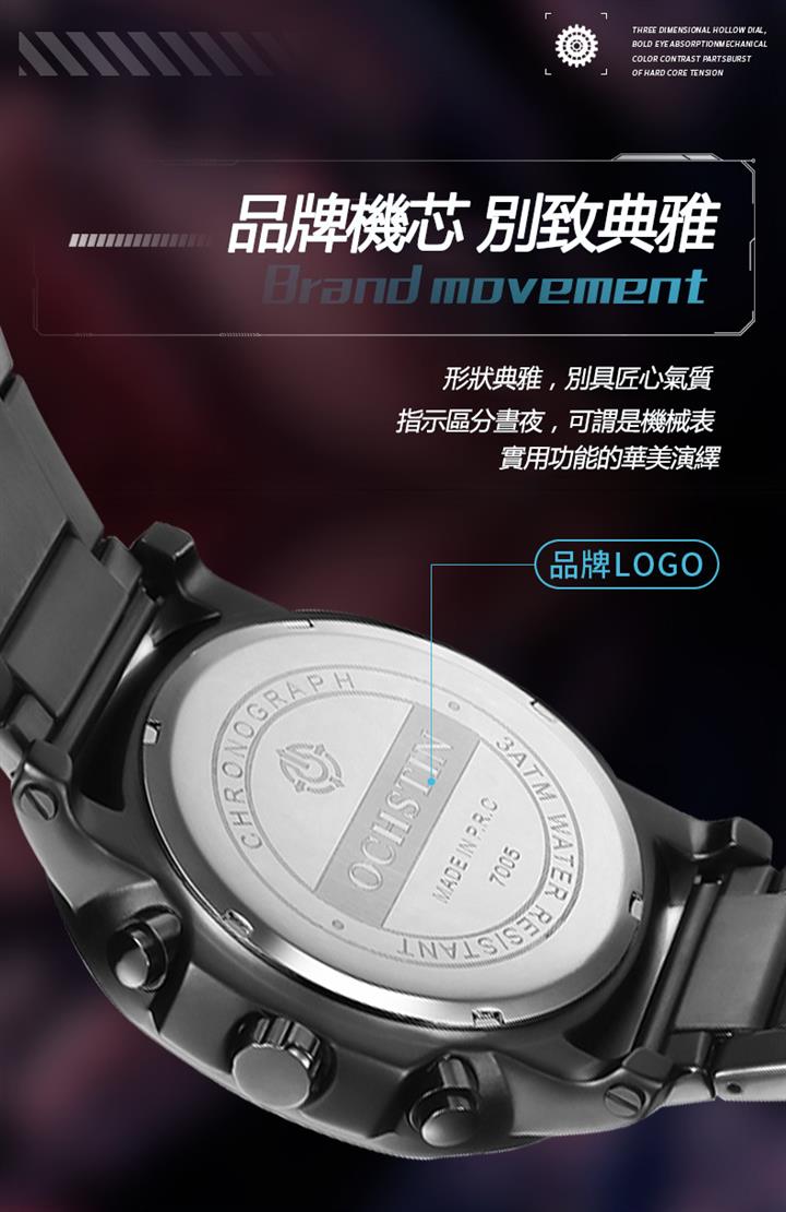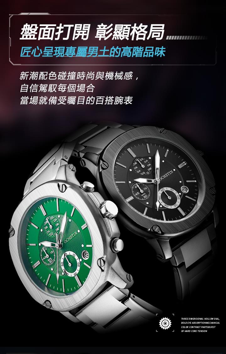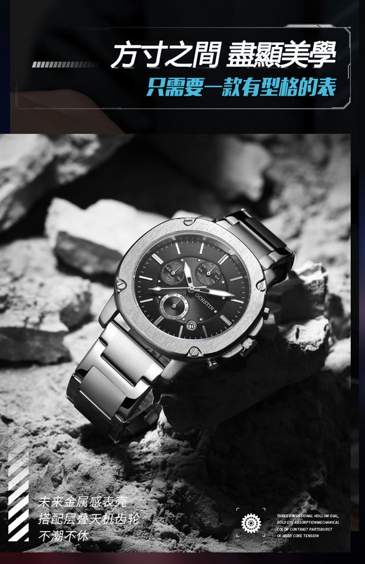 城市探險家系列 | 未來感金屬天機錶殼 | 真三眼多功能錶盤 | 實心精鋼錶帶 | 日曆視窗 | 夜光指針 | 30米防水 | ORCHSTIN男士多功能潮流手錶