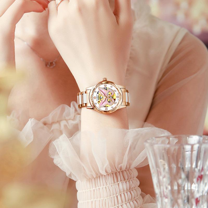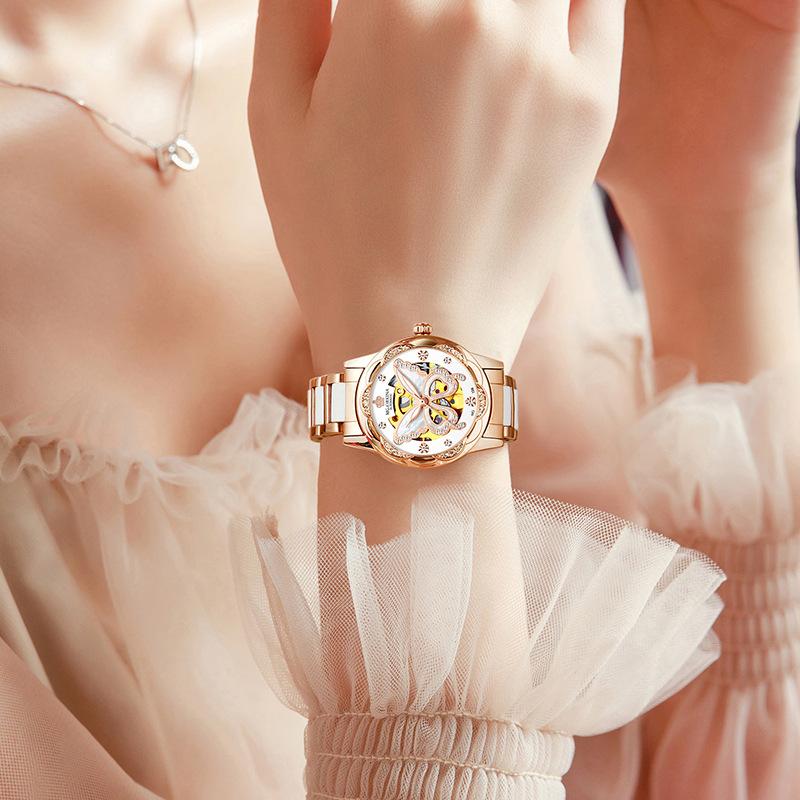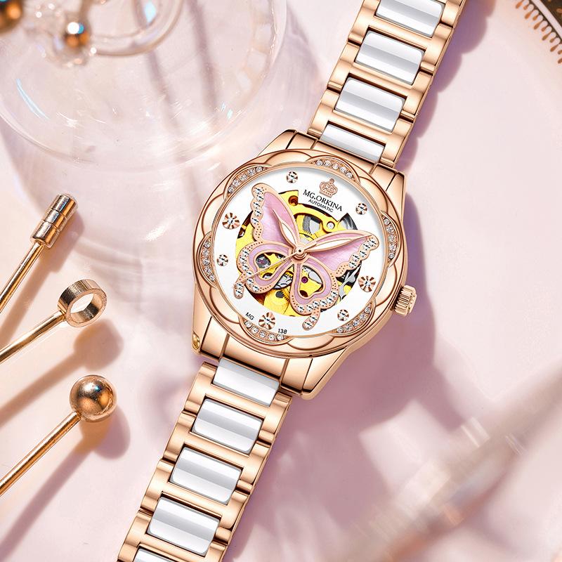 全自動機械機芯 | 名媛陶瓷錶帶 | 蝴蝶貝母錶盤 | MG.ORKINA奢華全自動機芯陶瓷錶帶櫻花鑲鑽鏤空錶盤手錶OL小資女神手錶