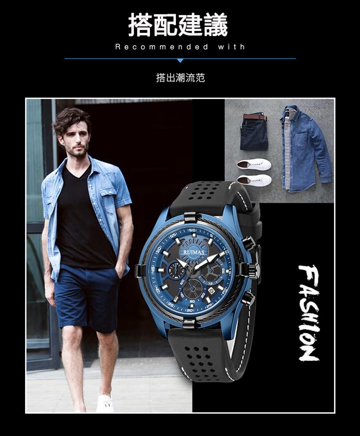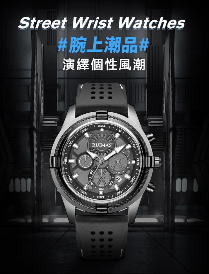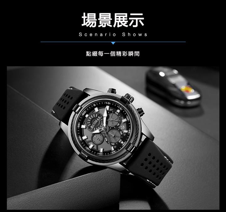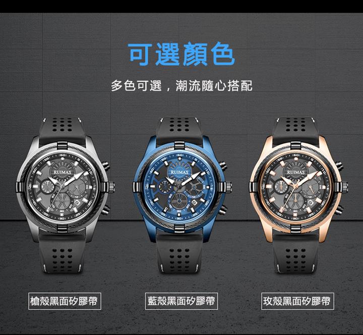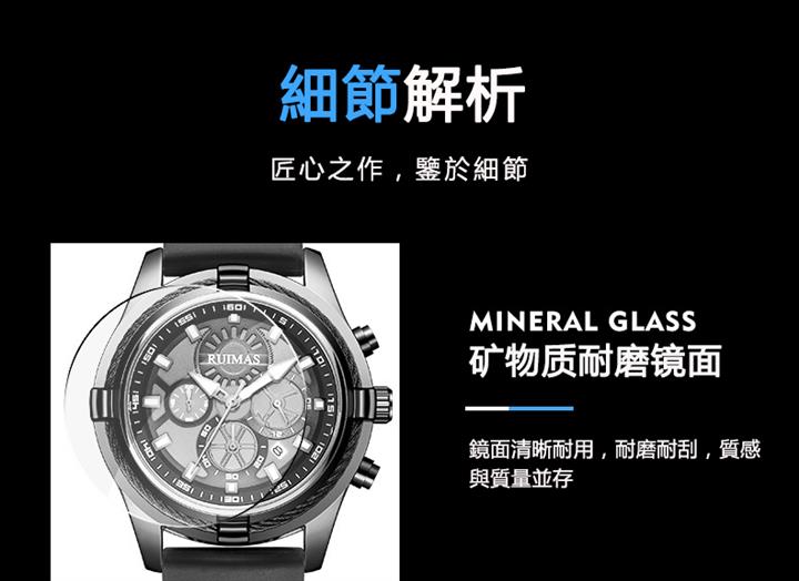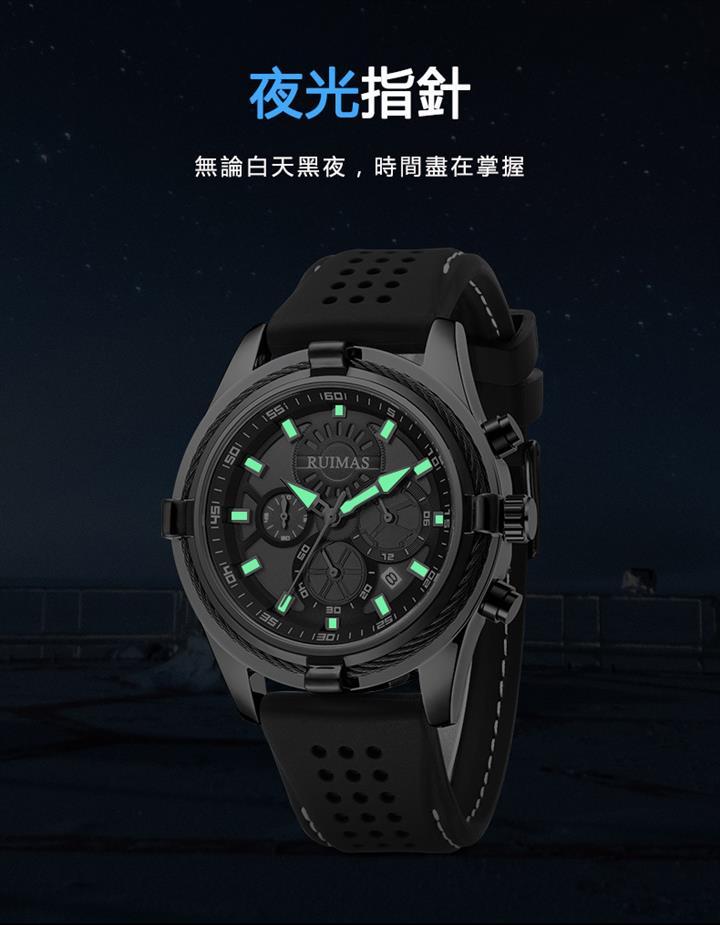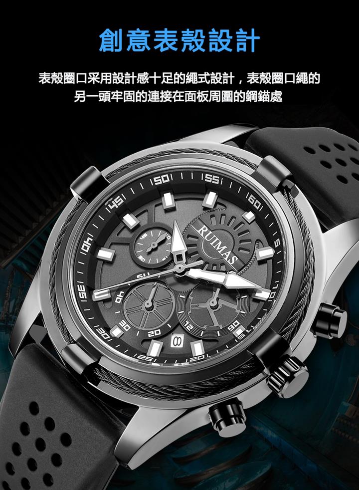 真三眼多功能錶盤 | 高強礦物玻璃鏡面 | 30米專業防水 | 防汗透氣矽膠錶帶 | 夜光刻度指針 | 日曆視窗 | RUIMAS腕上潮品多功能男士手錶
