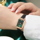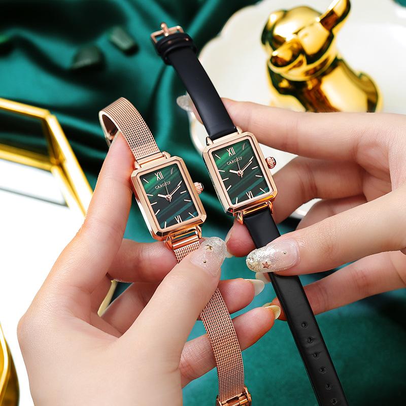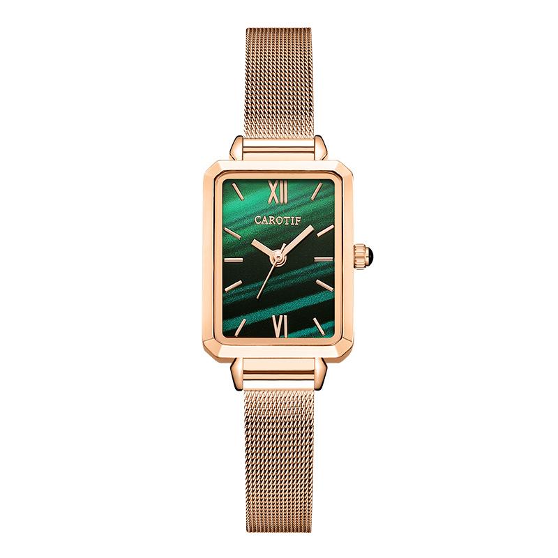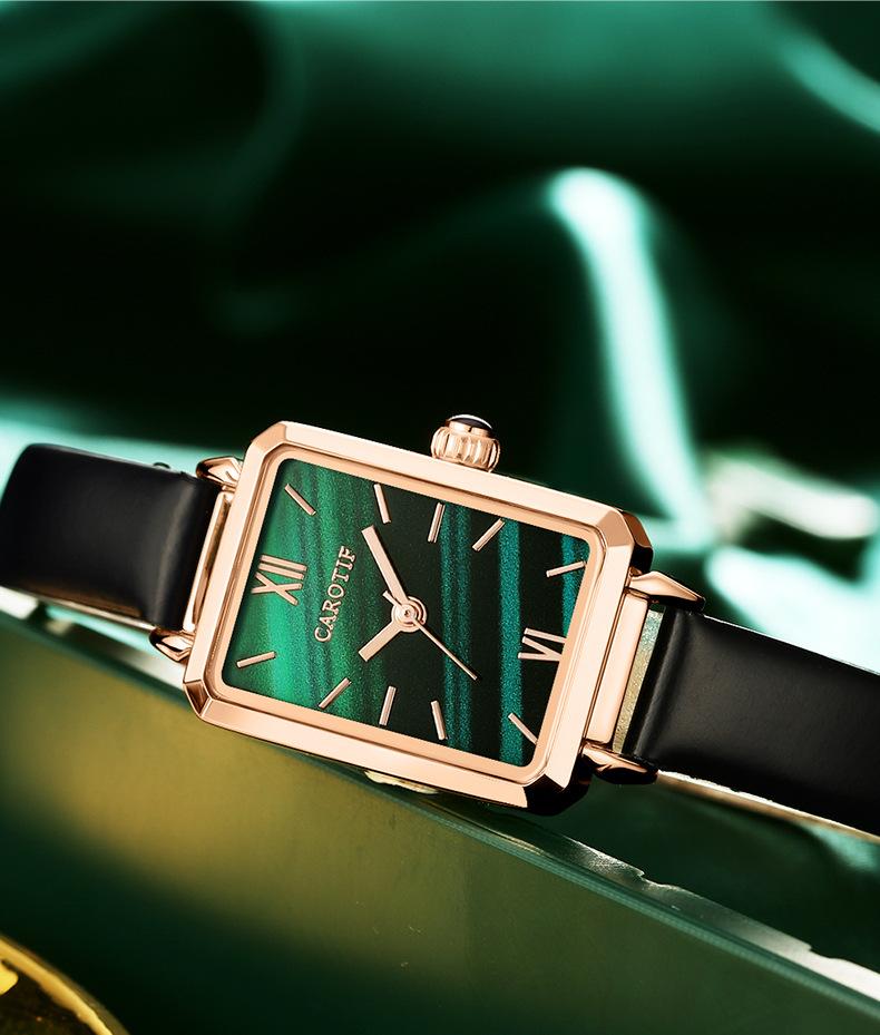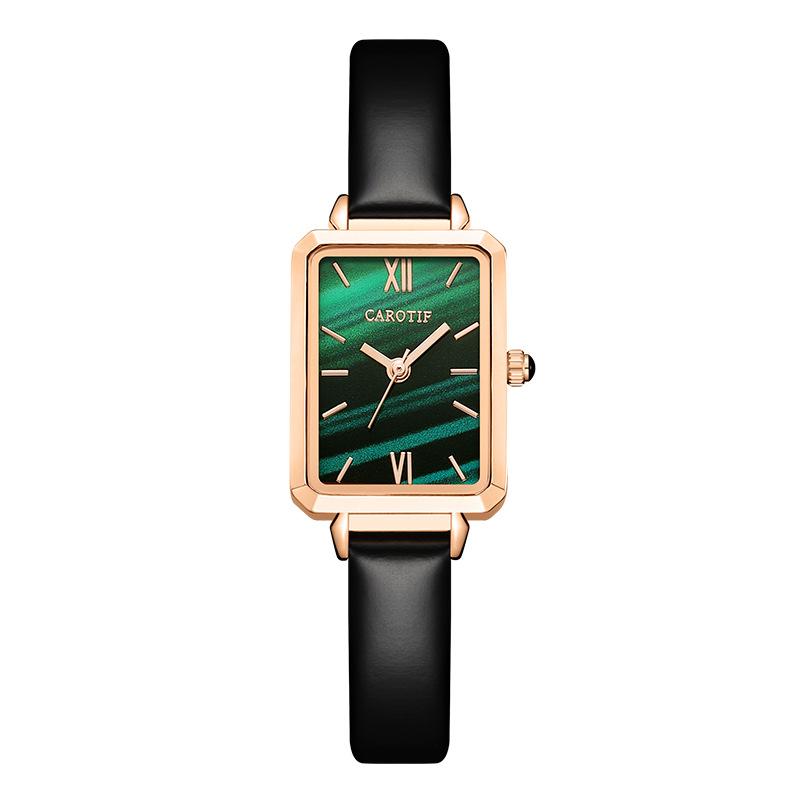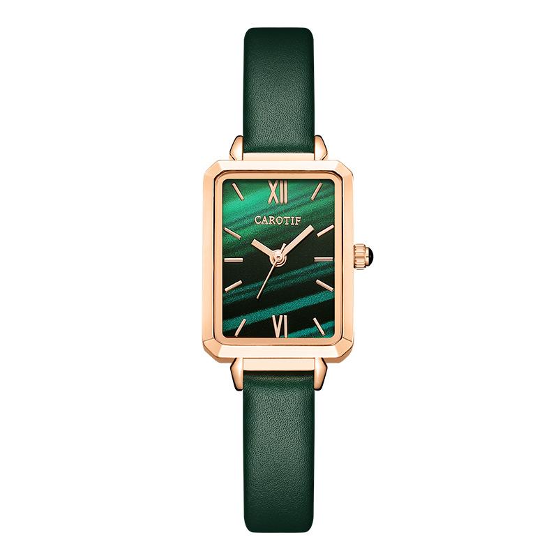 CAROTIF英倫經典孔雀綠條紋錶盤小方錶玫金真皮錶帶手錶氣質女錶