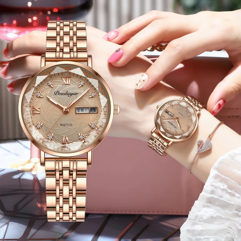 女錶・鎏金歲月 | 鑽石花型錶鏡 | 閃耀鑽型時計 | 精鋼蝴蝶釦錶帶 | 日本高級石英機芯 | 星期日曆顯示 | 50米深度防水 | 瑞士POEDAGAR女錶