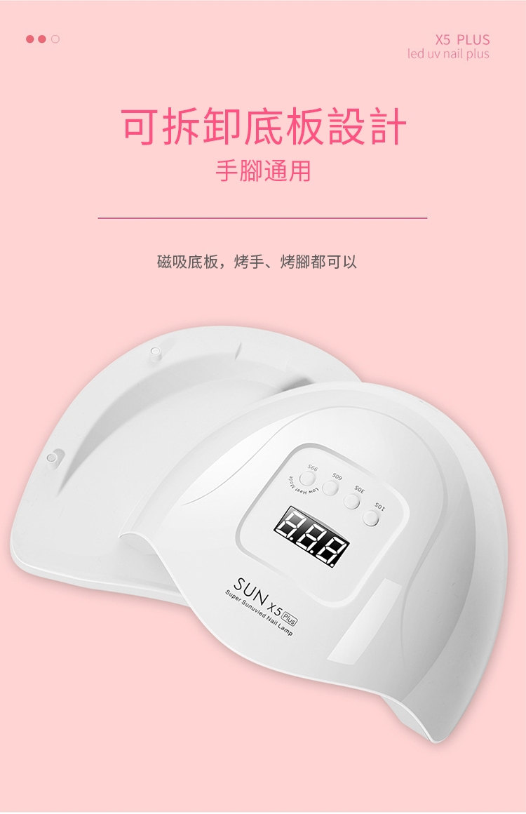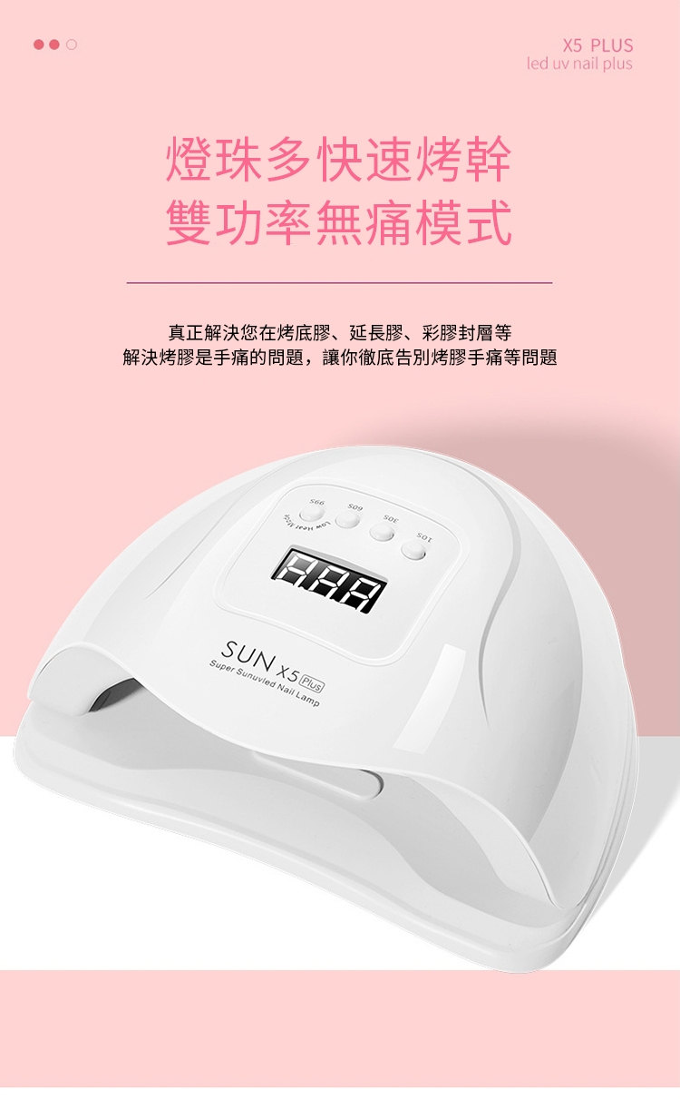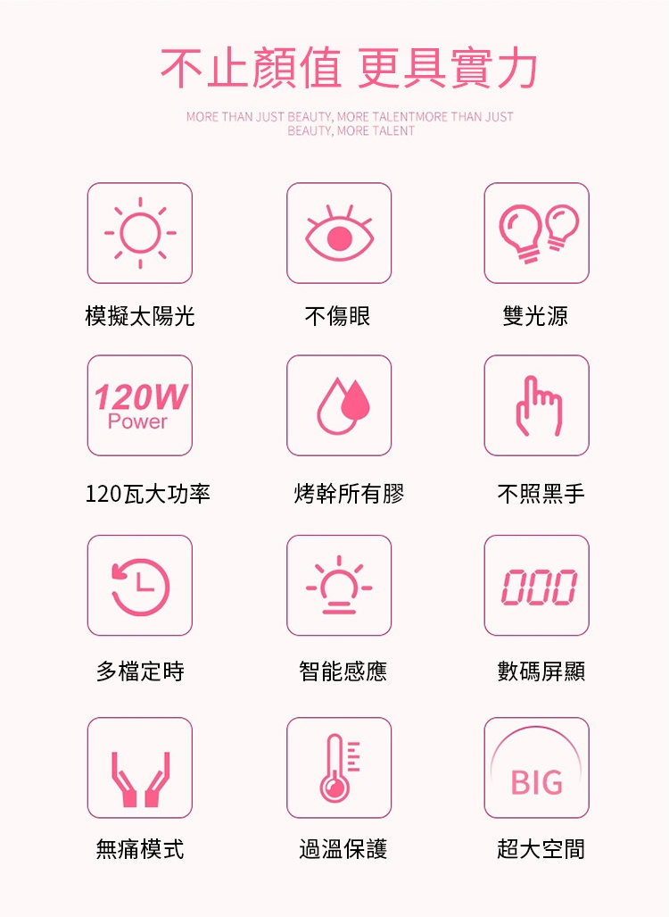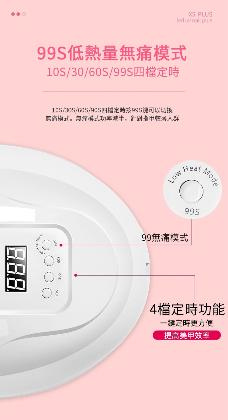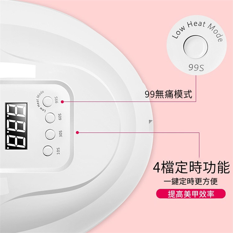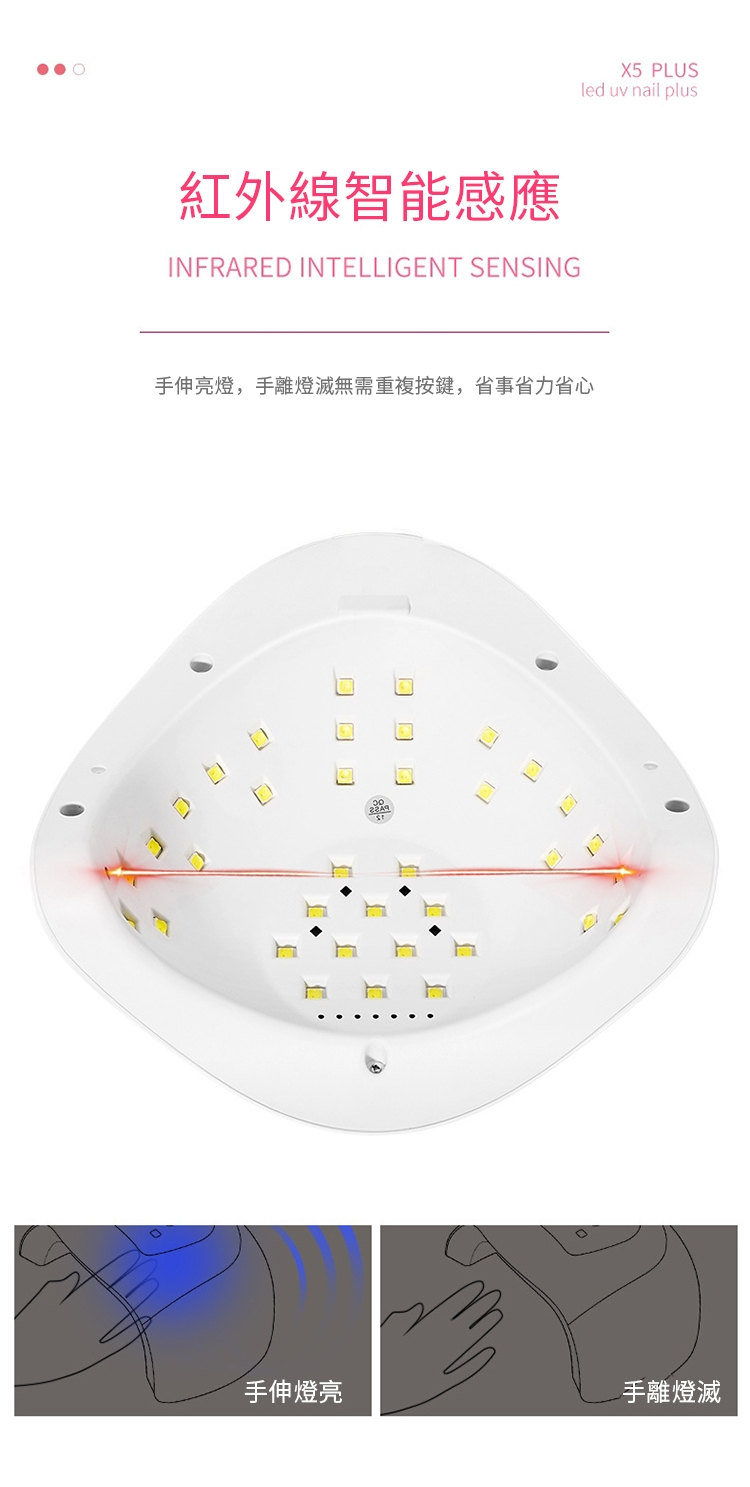 全場景智慧光療美甲機 | 智慧紅外感應控制開關 | 升級LC型LED雙光源燈珠不黑手 | 支援99s低熱無痛模式 | 安全過熱保護 | 多功能光療美甲燈