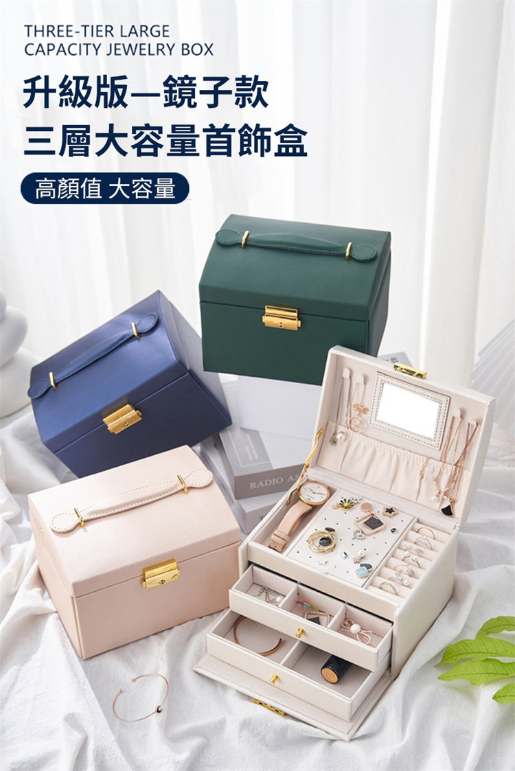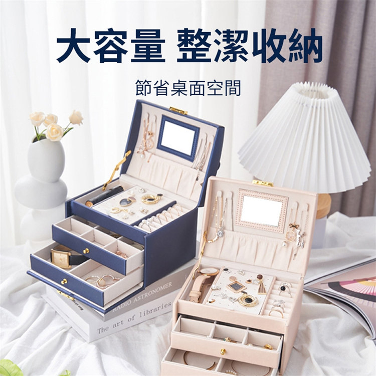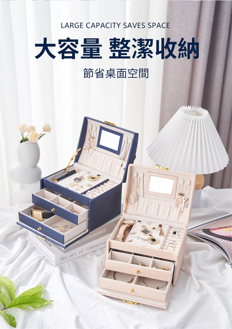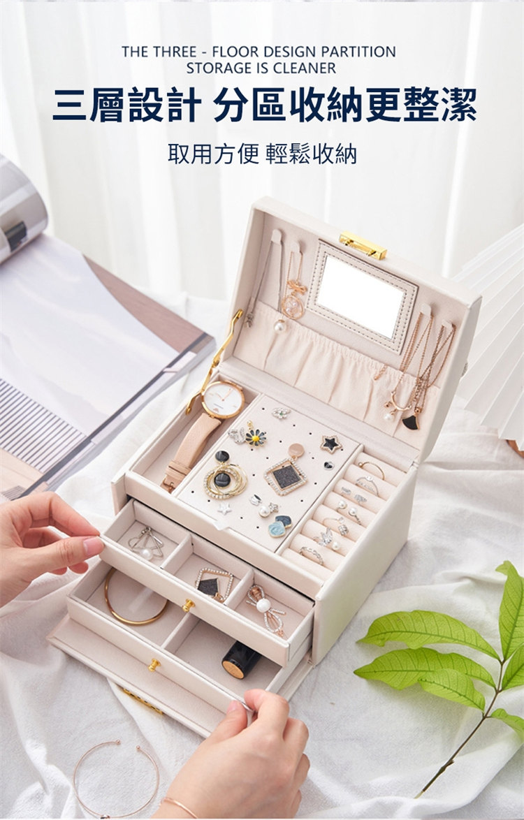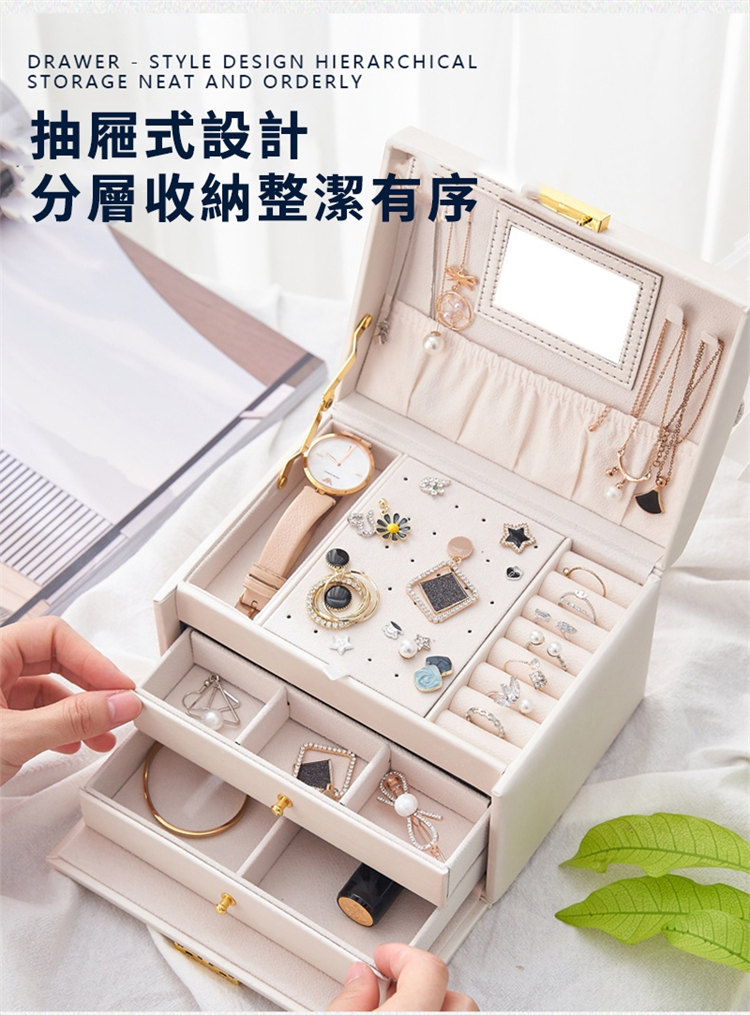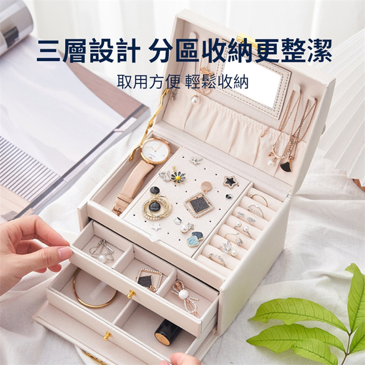 在逃公主高級大容量首飾盒 | 三層設計分區收納 | 質感耐磨皮料內植絨 | 超合適送閨蜜送女生禮物項鍊戒指耳環手鍊手錶全功能抽屜式收納盒