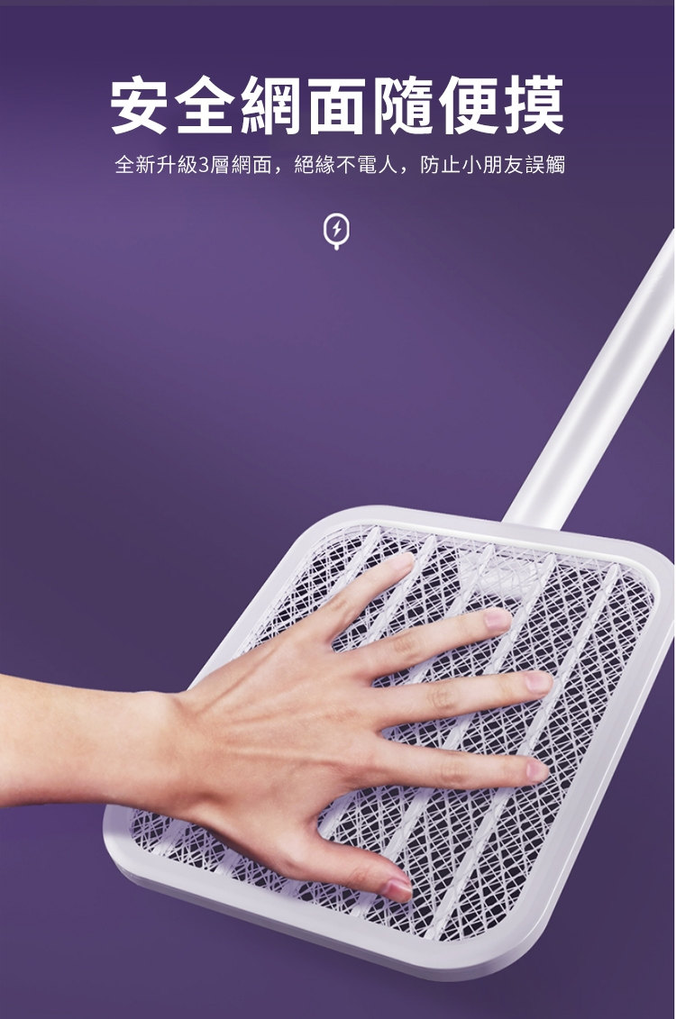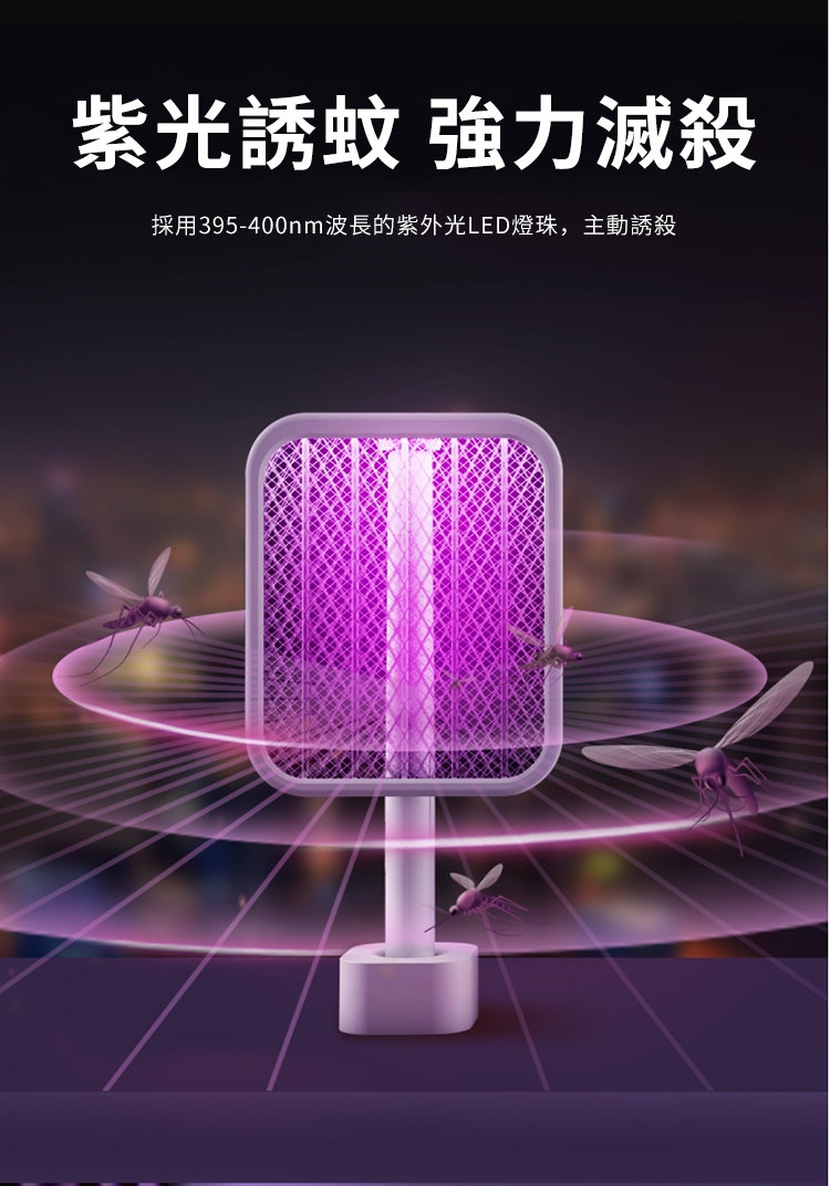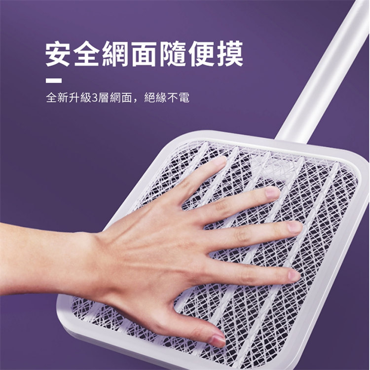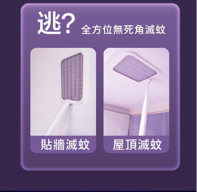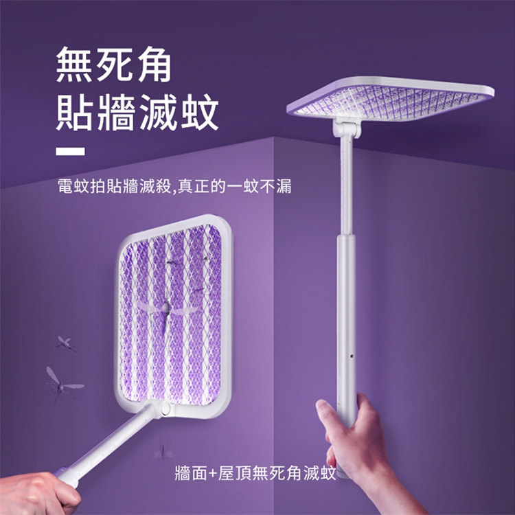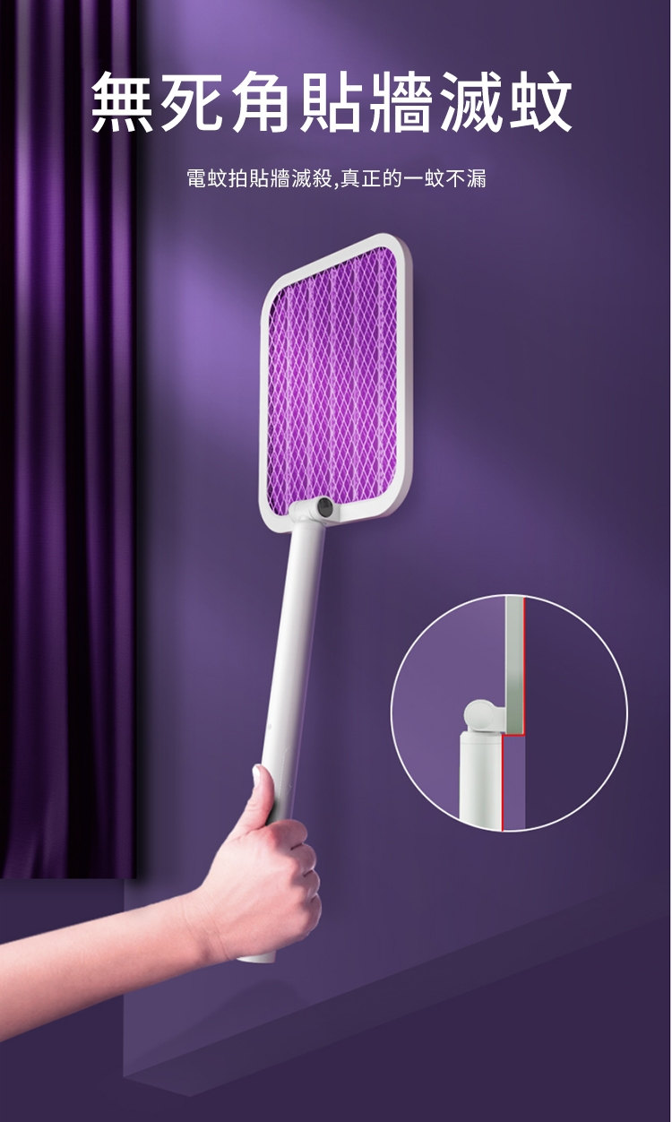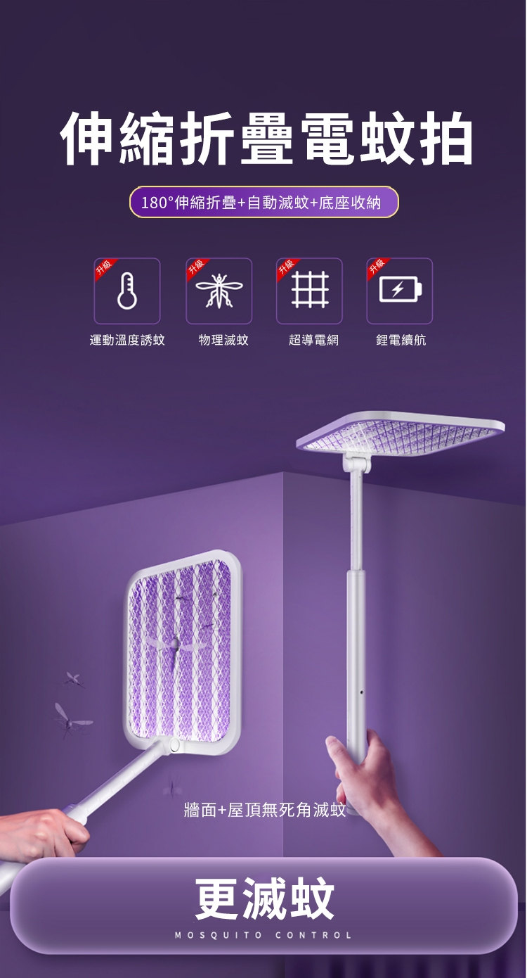 全功能無死角貼墻高效電蚊拍 | 可做滅蚊燈 | 紫光擬態雙重誘蚊 | 全新超導電網強力滅蚊 | 三層安全防護網 | 180伸縮折疊好收納 | 居家滅蚊旗艦