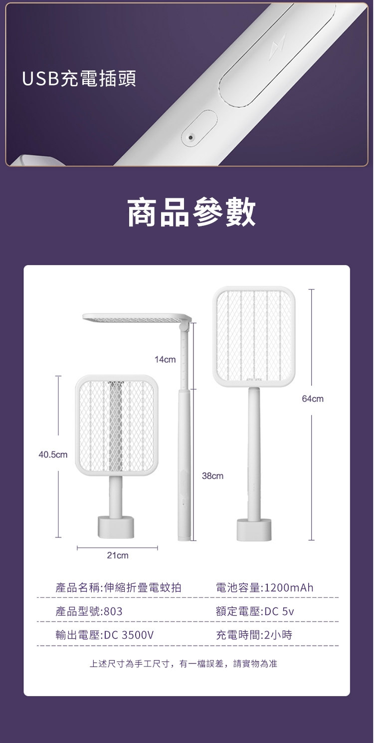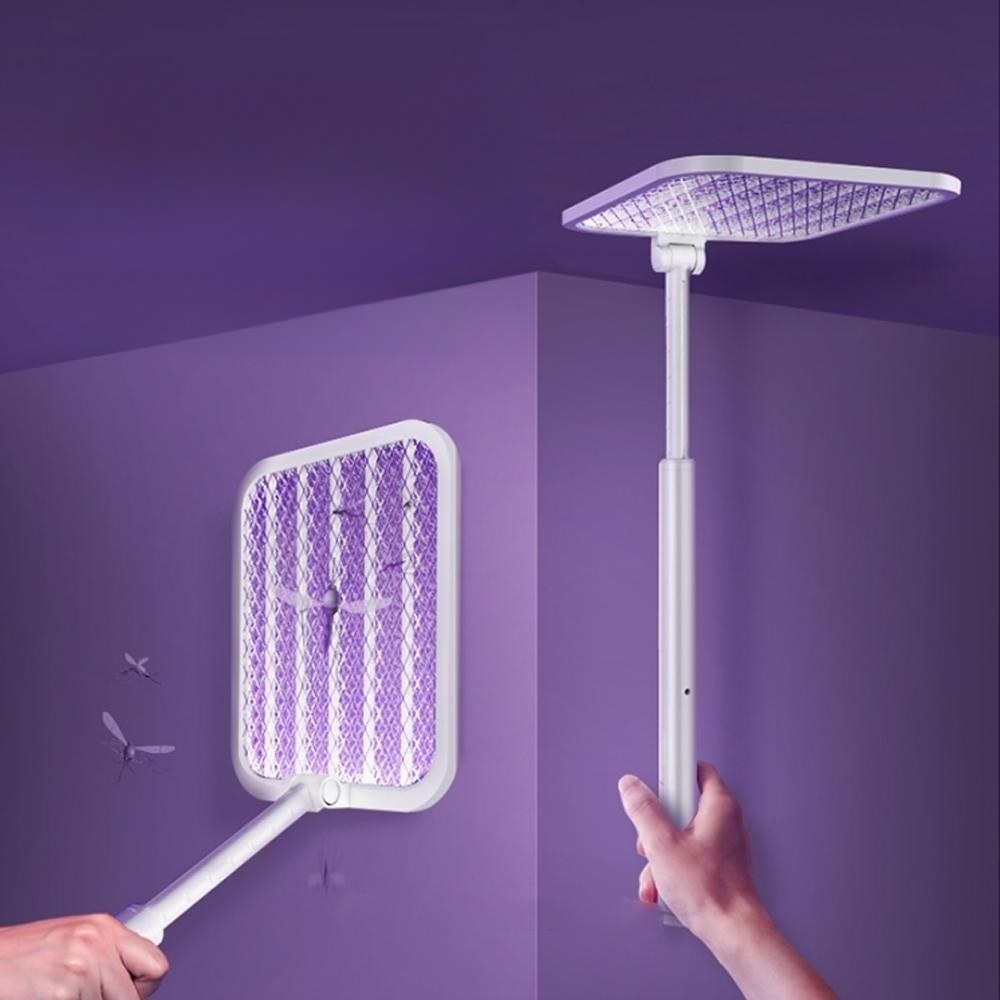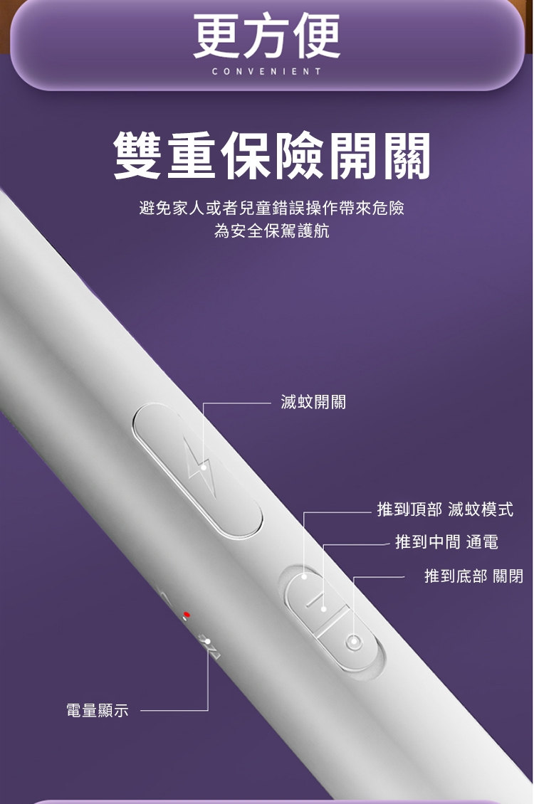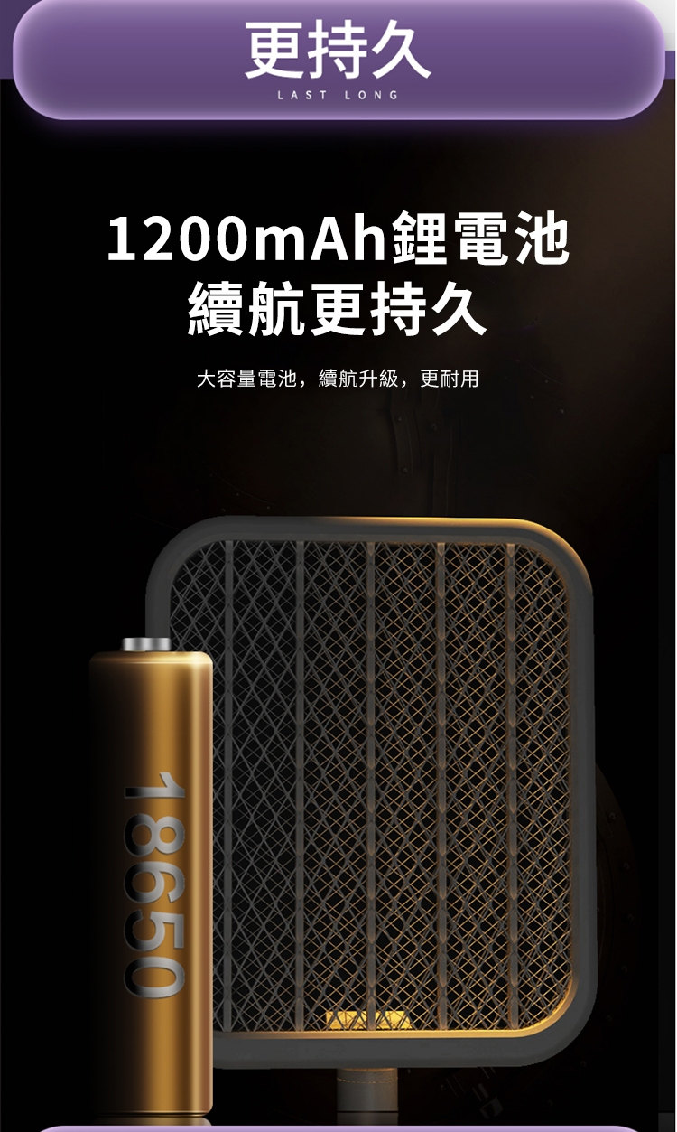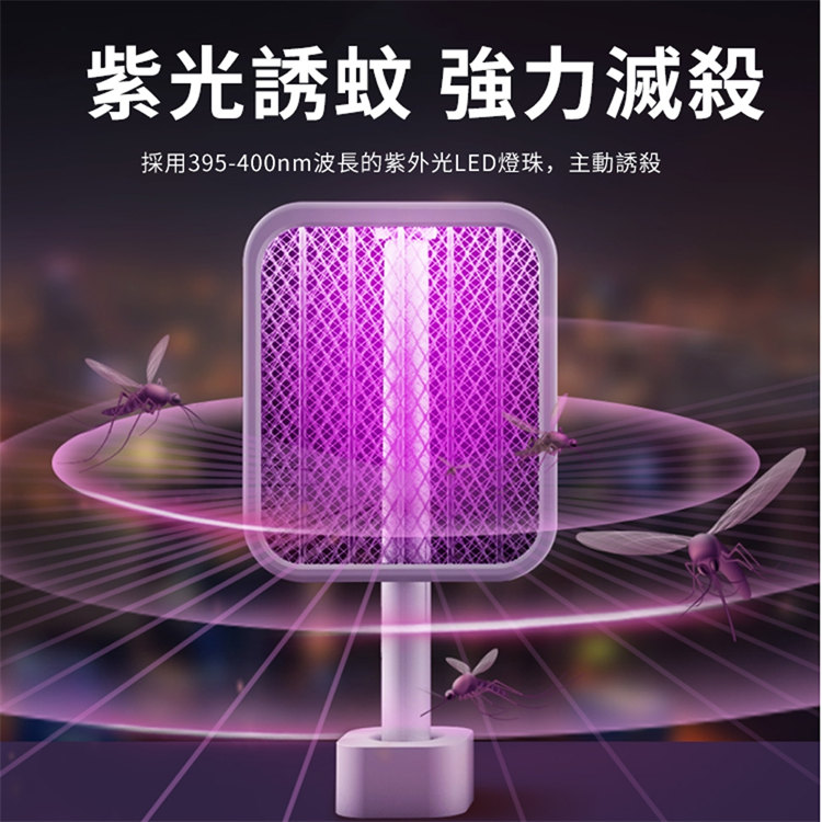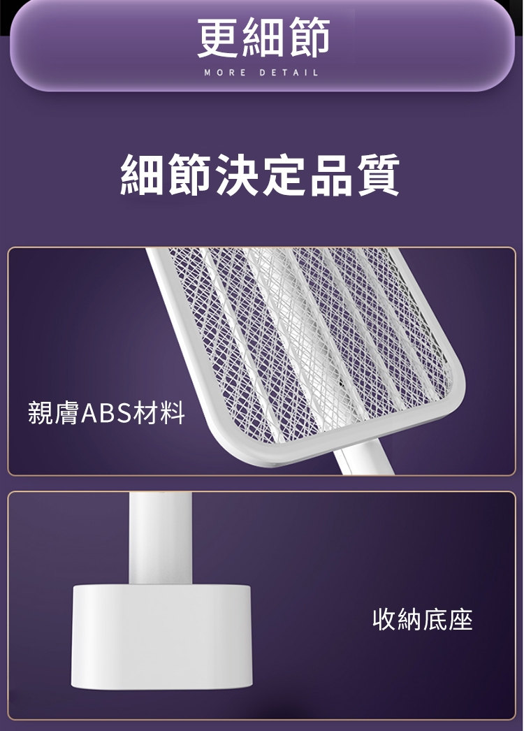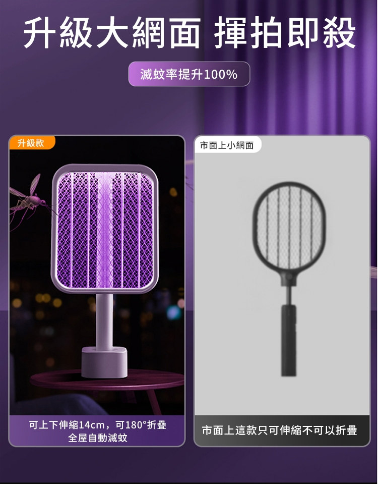 全功能無死角貼墻高效電蚊拍 | 可做滅蚊燈 | 紫光擬態雙重誘蚊 | 全新超導電網強力滅蚊 | 三層安全防護網 | 180伸縮折疊好收納 | 居家滅蚊旗艦