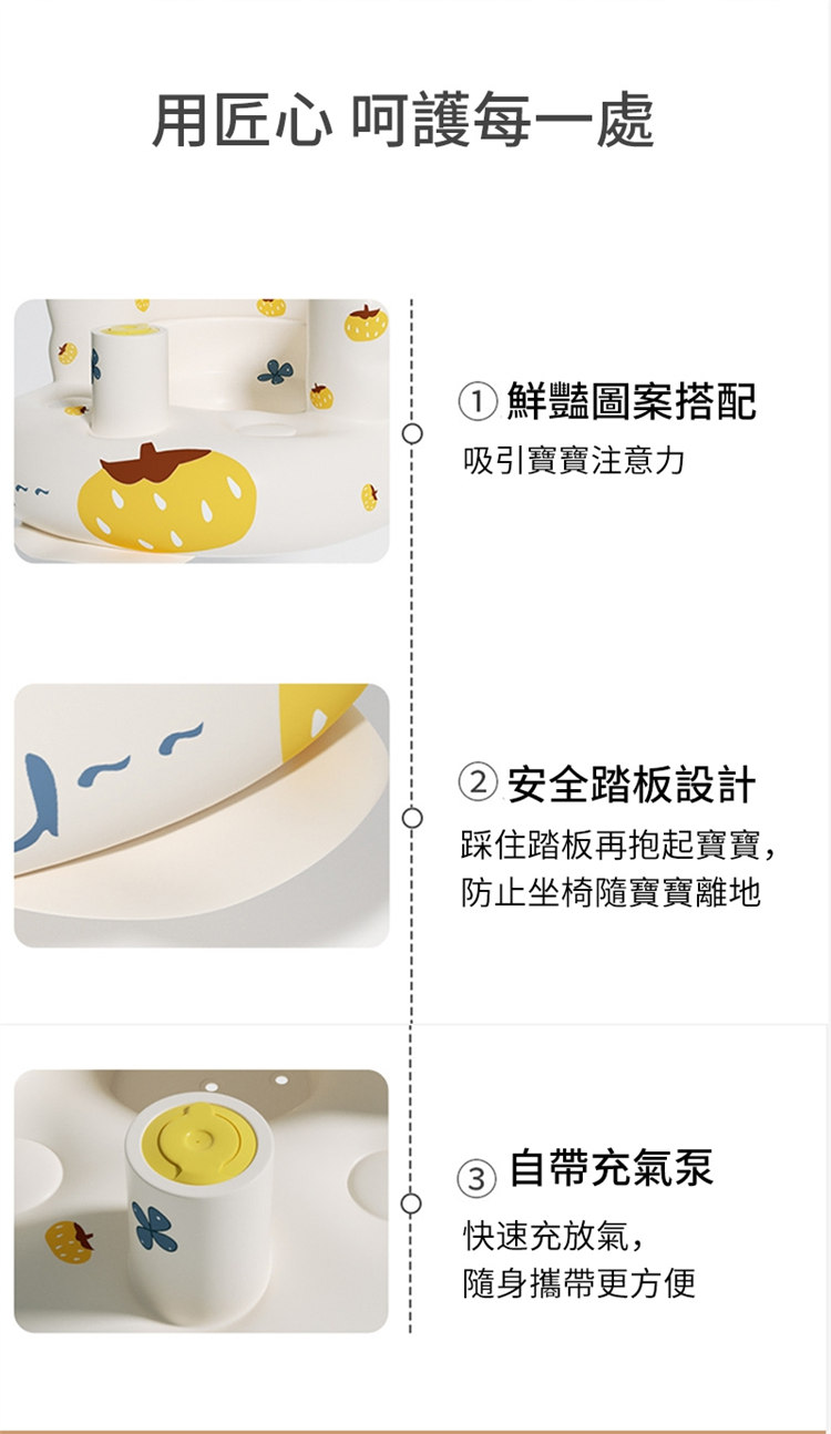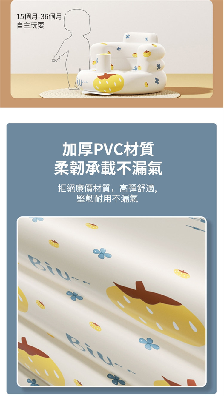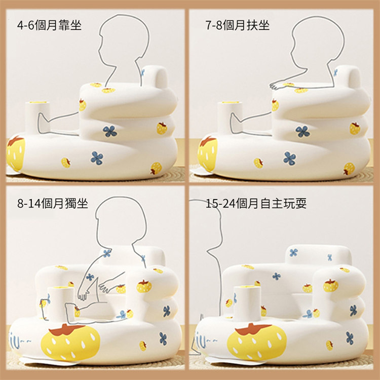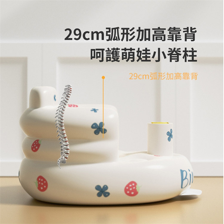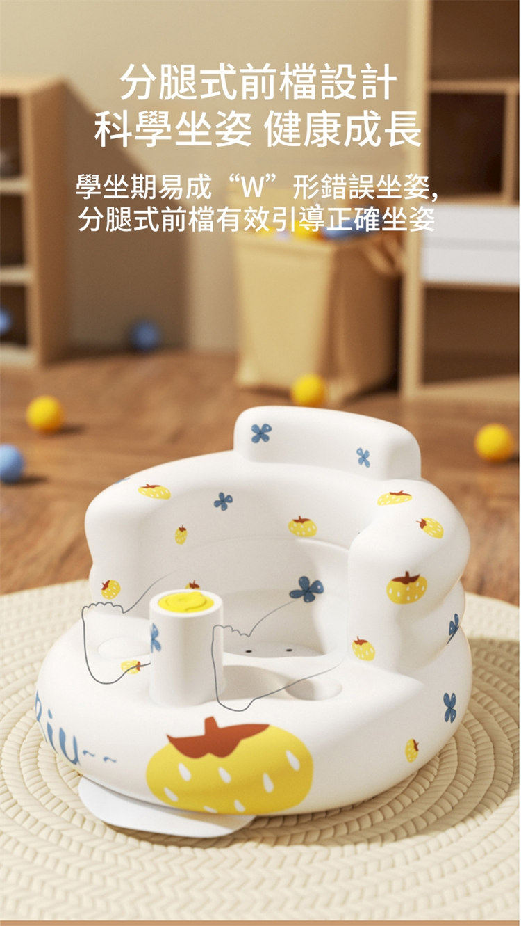防翻防摔寶寶學坐充氣沙發椅 | 弧形加高靠背呵護脊椎 | 分腿式前檔引導科學坐姿 | 環保PVC無毒無味 | 自帶充氣泵 | 專業級寶寶嬰兒學坐沙發椅