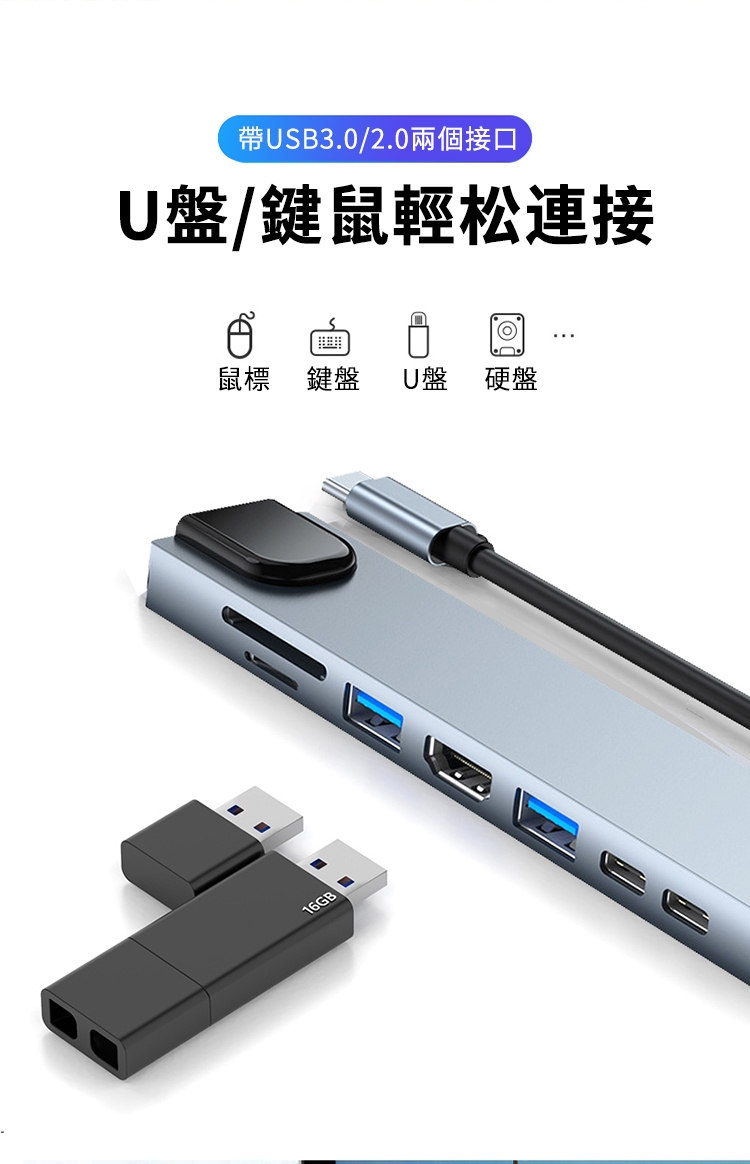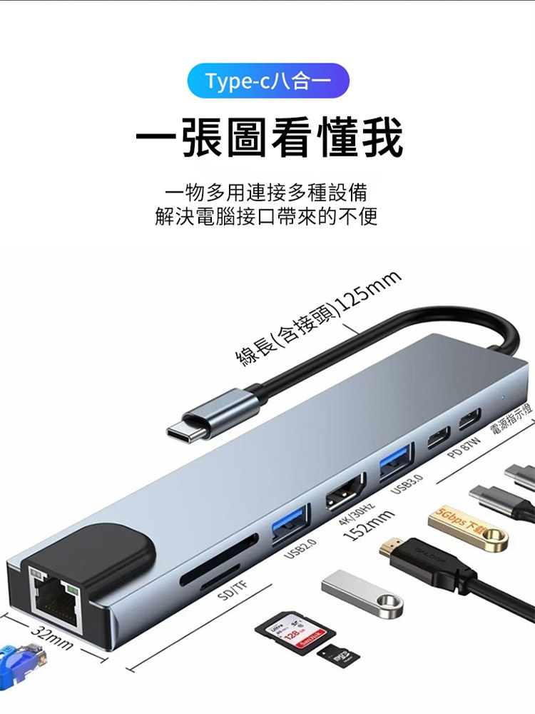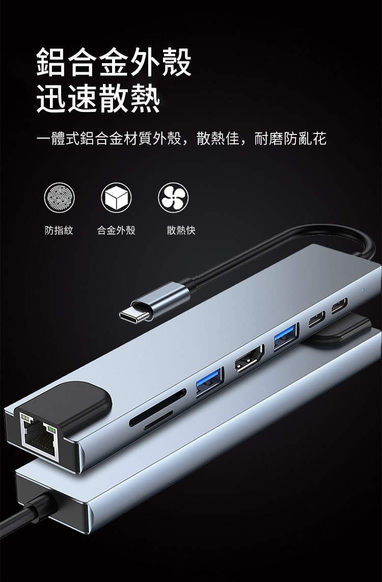 發燒級TYPE-C八合一多功能高效擴展塢 | USB3.0高速傳輸 | HUB轉接器 | PD快充 | 充電傳輸集線器 | 網線轉接頭 | 鋁合金散熱外殼 | 多口穩定運行