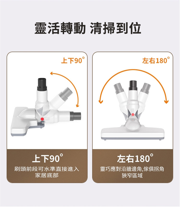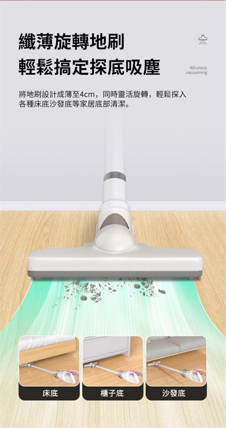 • 纖薄旋轉地刷,輕鬆搞定探底吸塵