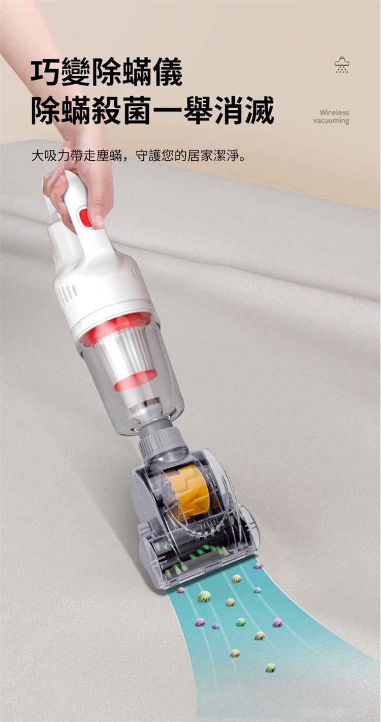 全功能旗艦無線除螨吸塵器 | 除螨吸塵兩用 | 手持推桿雙模式 | 纖薄旋轉地刷 | 八核永磁聚吸電機 | 12000Pa暴風吸力 | 多重過濾強清潔 | 送四刷頭