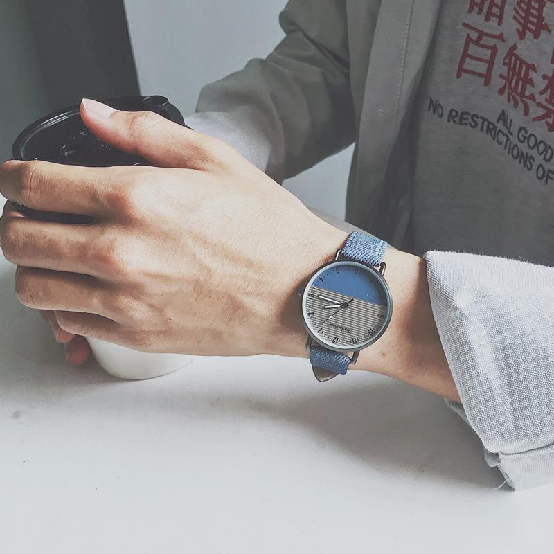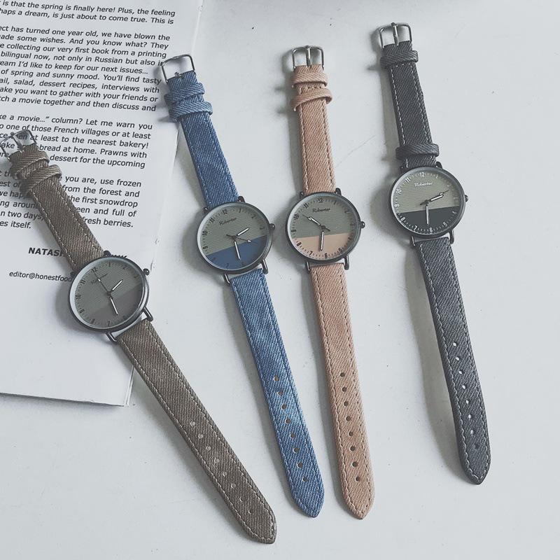 日式原宿個性拼色錶盤復古牛仔皮帶中性男女手錶