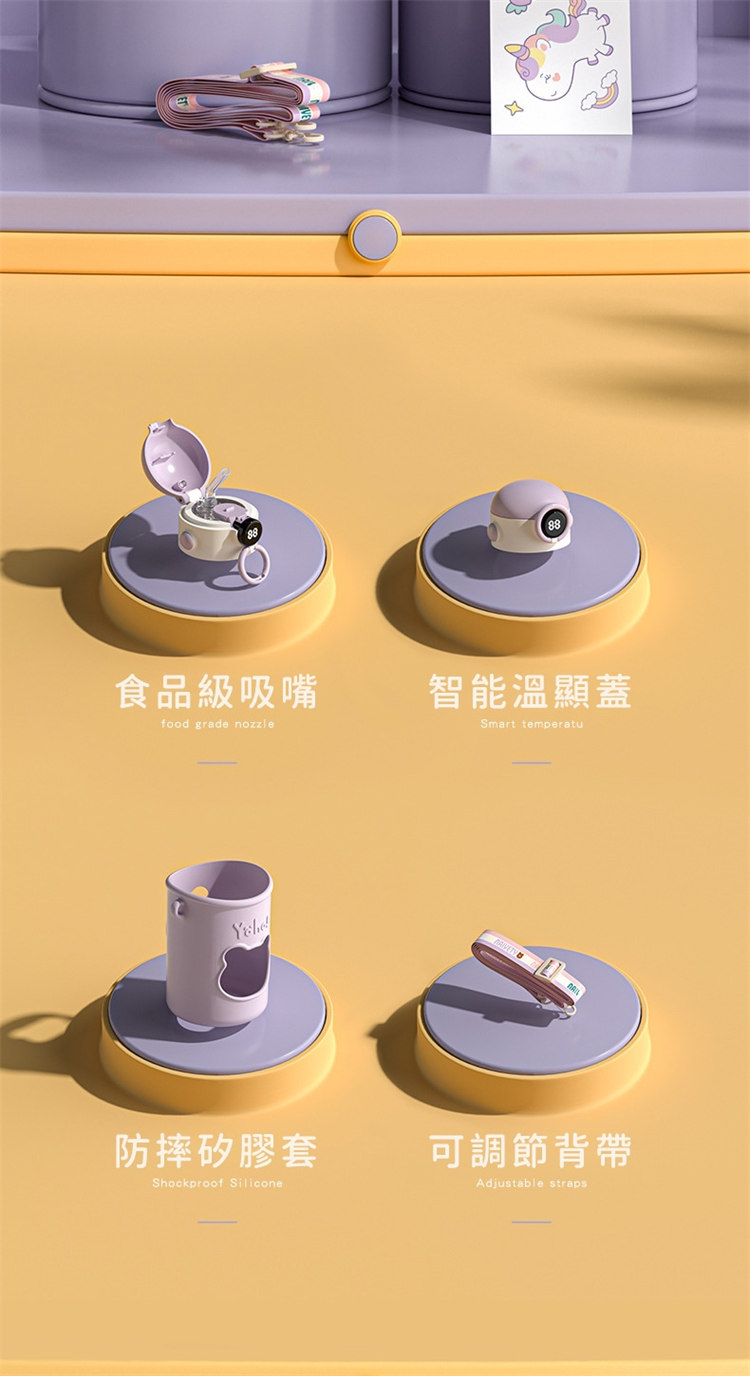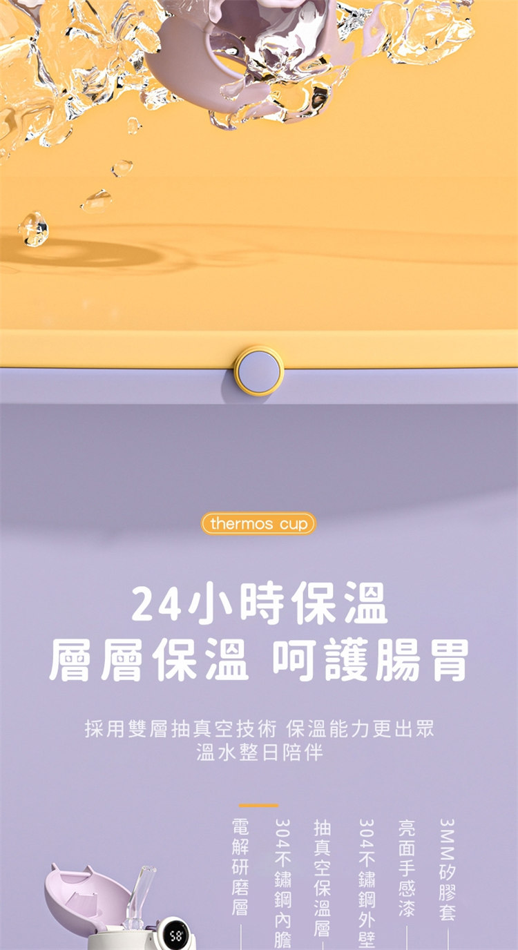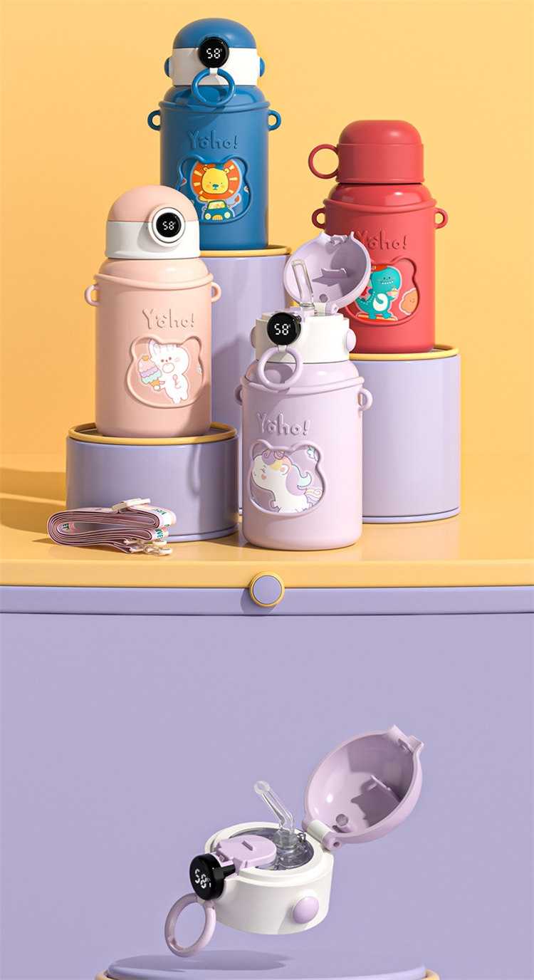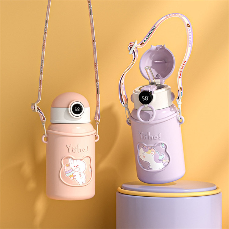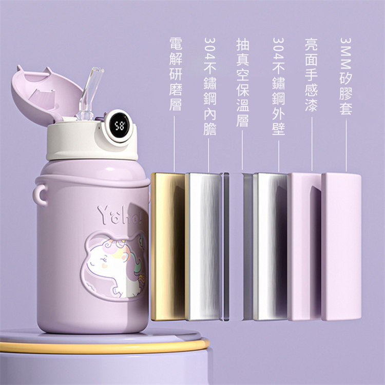 智慧溫度顯示彈跳吸管保溫杯 | 24小時真空保溫 | 安全316不鏽鋼內膽 | 食品級矽膠吸嘴 | 二段開蓋防燙 | 可調節肩帶 | 矽膠杯套少女心保溫瓶