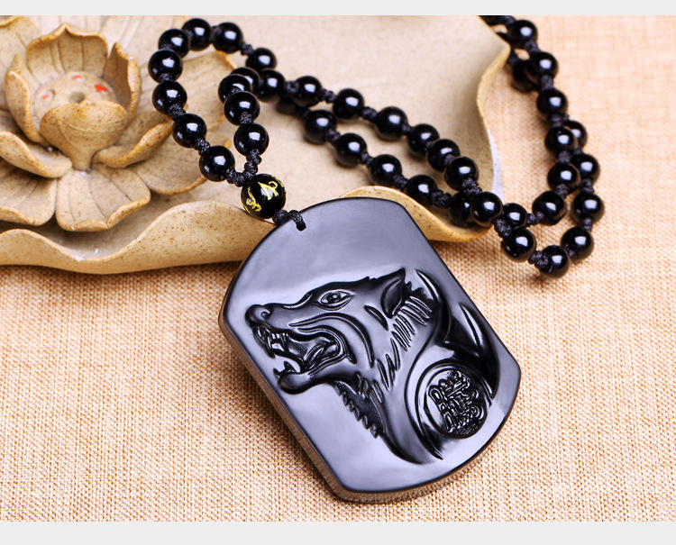 【天然黑曜石精雕狼圖騰】辟邪護身勇氣天然黑曜石精雕狼頭狼圖騰方牌吊墜項鍊 (天然黑曜石)