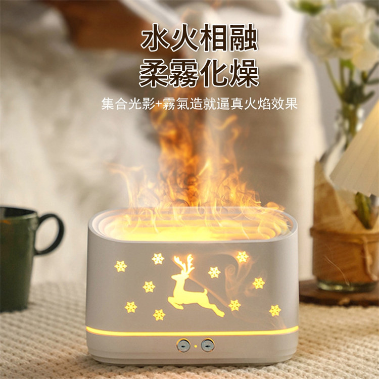 花鹿火焰精油香氛水氧機 | 奈米柔霧擴香 | 逼真光影冷火焰 | 三檔出霧調節 | 黃藍雙色夜光 | 大容量持久擴香 | 浪漫花鹿聖誕禮物香氛加濕擴香機
