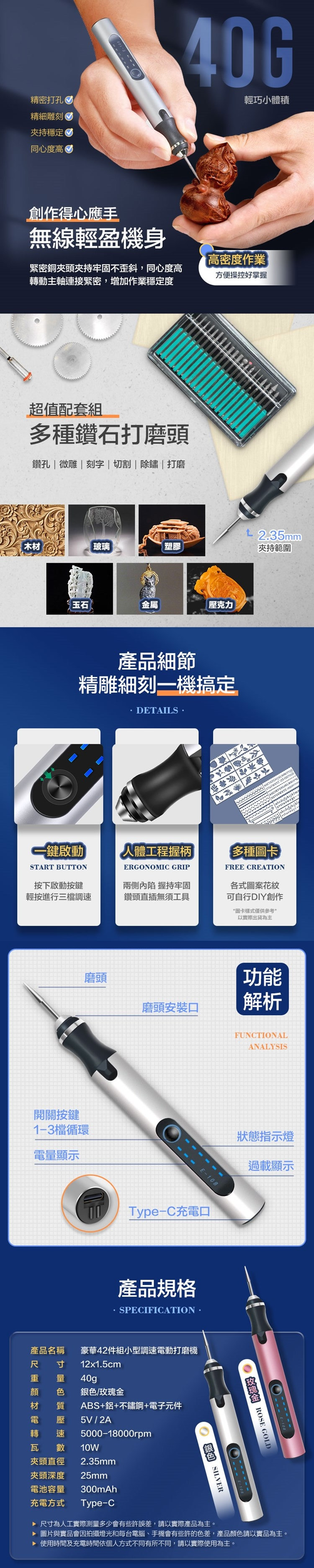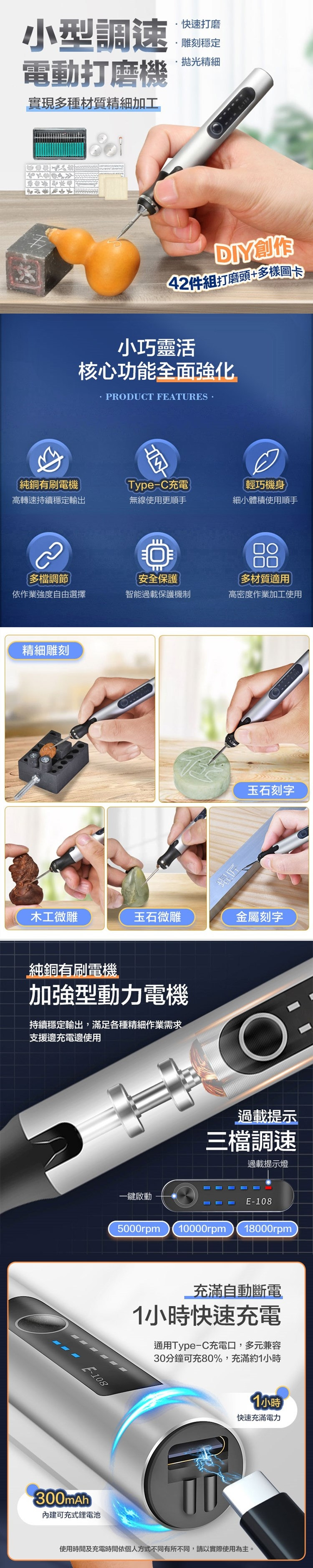 工匠級全功能電動打磨機 | 附送全材質打磨頭套組 | 純銅高速馬達 | 三檔強度可調 | TYPE-C快充 | 智慧過載保護 | 快速打磨微雕刻拋光電動打磨筆